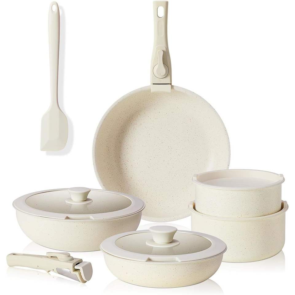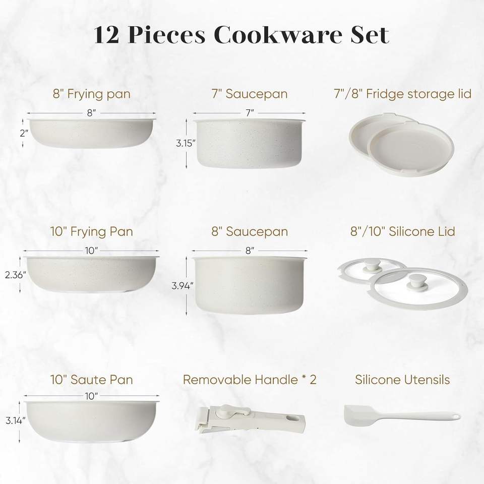 Set di Pentole Antiaderenti da 12 Pezzi Bianco Latte per Cucina a Induzione, Lavabili in Lavastoviglie e Adatte al Forno, con Manico Staccabile
