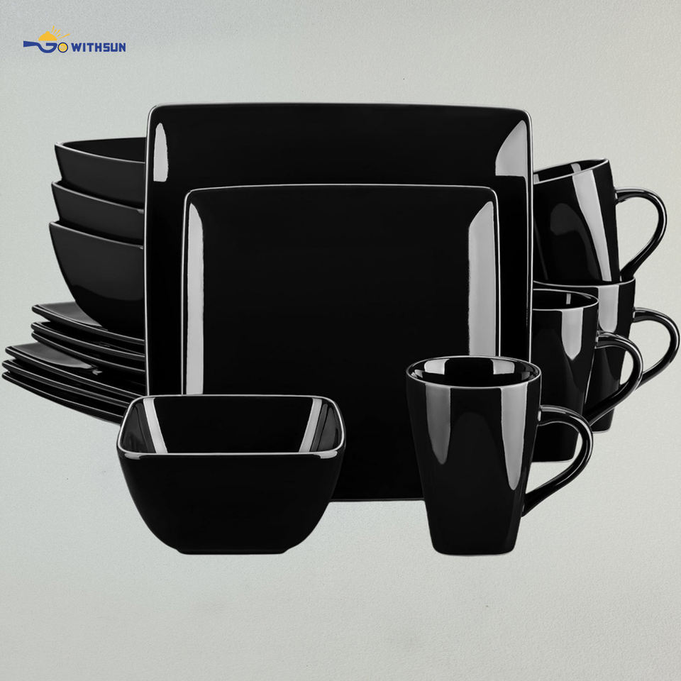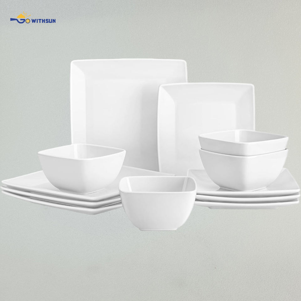12 Pieces Disposable Ceramic Dinnerware Sets White Red Black Stoneware Square Place Setting Dinner Dessert Plate Bowls Service 4