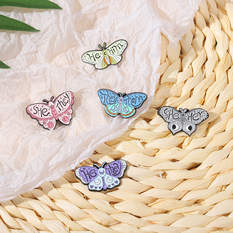 12 Stili di Spille in Metallo Smaltato Placcato con Pronomi a Farfalla Personalizzati SHE HER HE HIM THEY, Distintivi da Bavero Duri