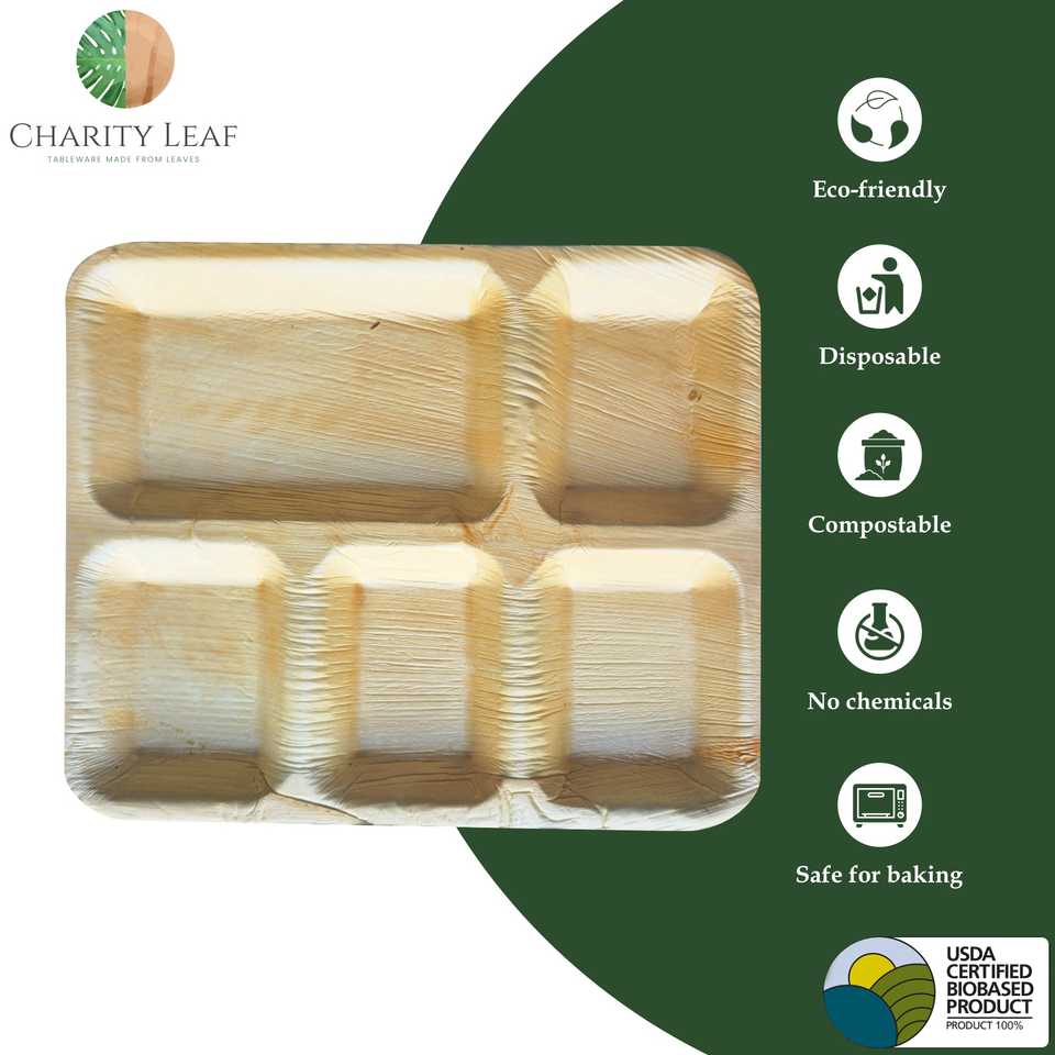 Piatto Rettangolare in Foglia di Palma Naturale 12 x 10 Pollici con 5 Scomparti per Decorazione Tavola e Stoviglie per Feste