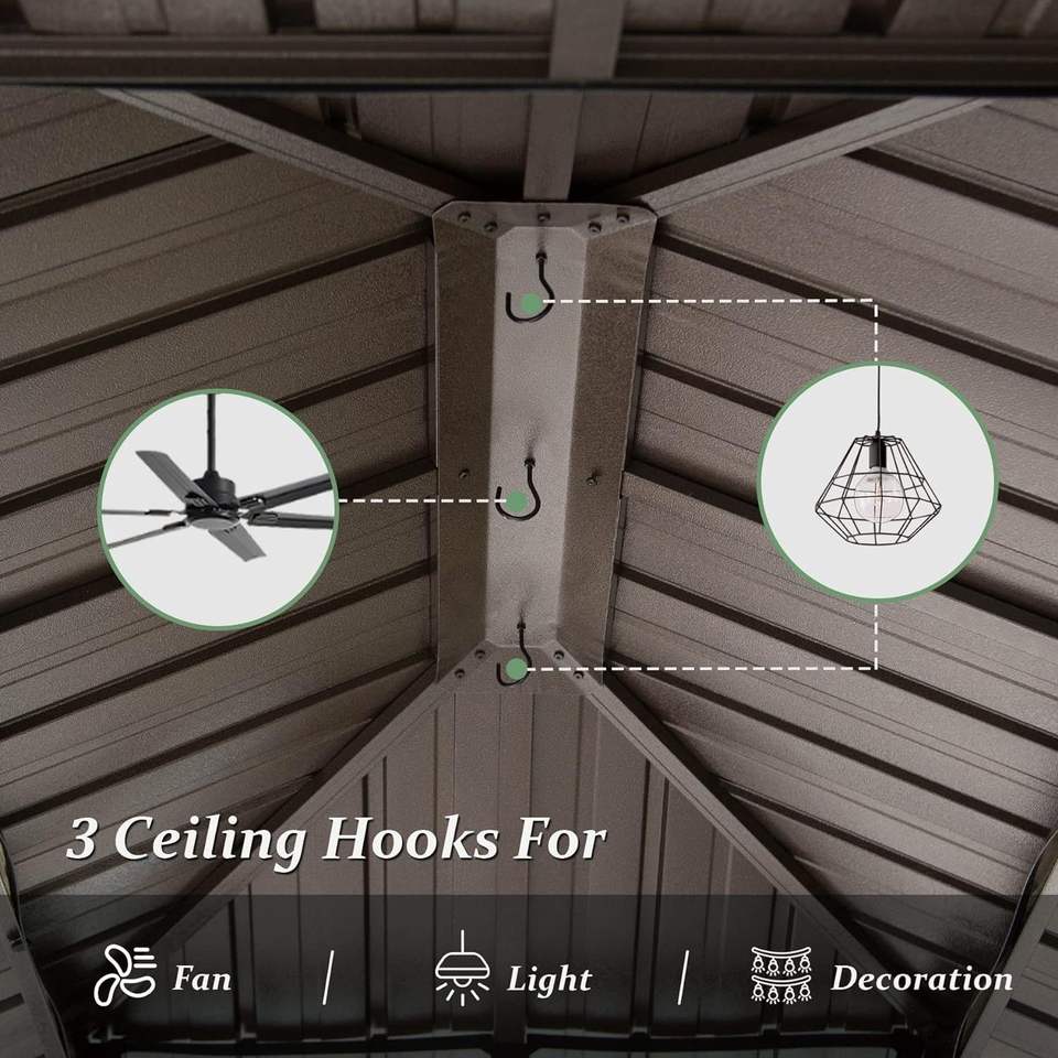 12'x14' Brown Cedar Wood Hardtop Gazebo Galvanized Steel Double Roof Outdoor Permanent Metal Pavilion Featuring Curtains Netting