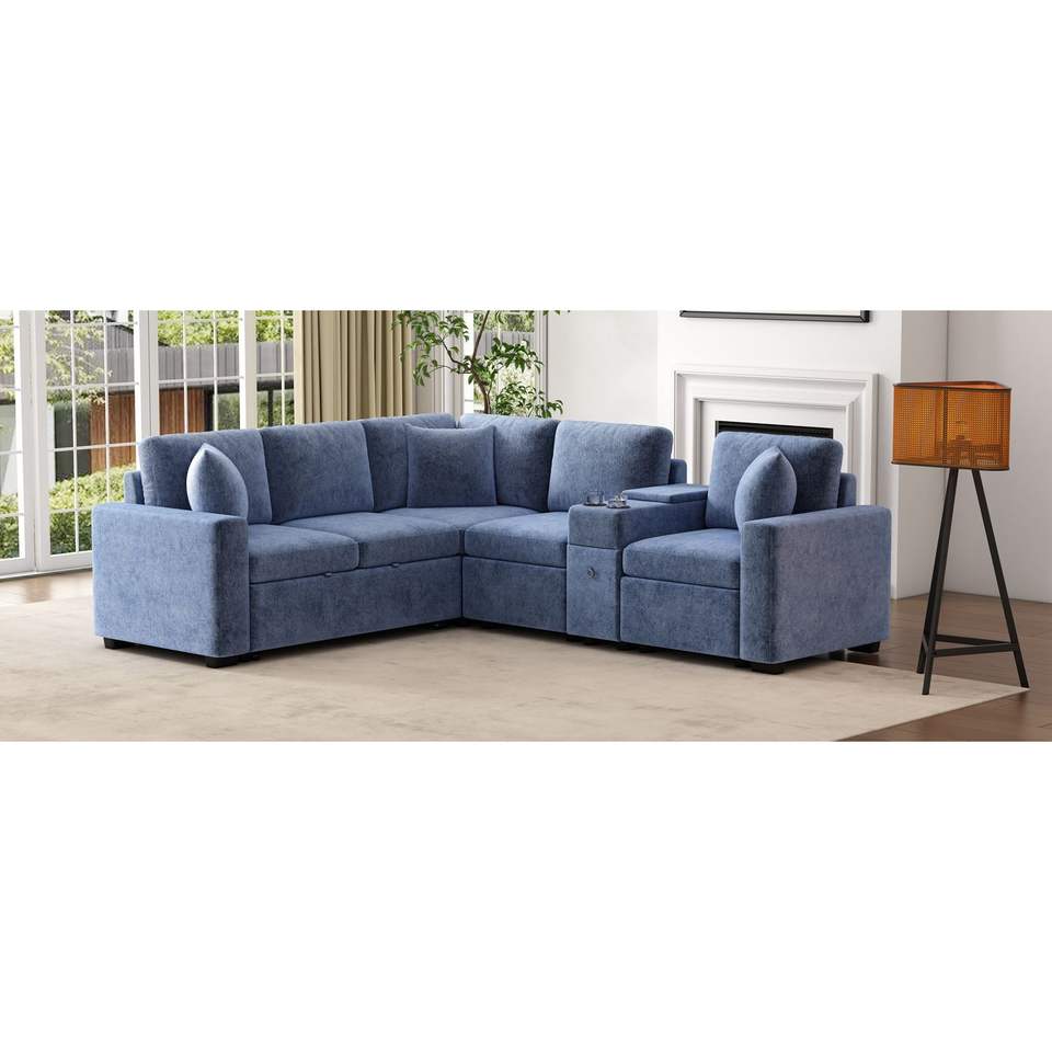 120.5\" Blue L-Shaped Convertible Sofa Bed Modular Sectional Reversible Pull-Out Sleeper Cup Holders Ample Storage Living Room