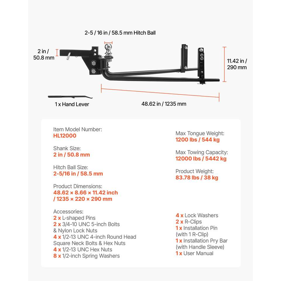 Kit di Distribuzione del Peso per Gancio di Traino con Controllo Oscillazione, Capacità Massima 12000 Libbre, Include Supporti per Gancio