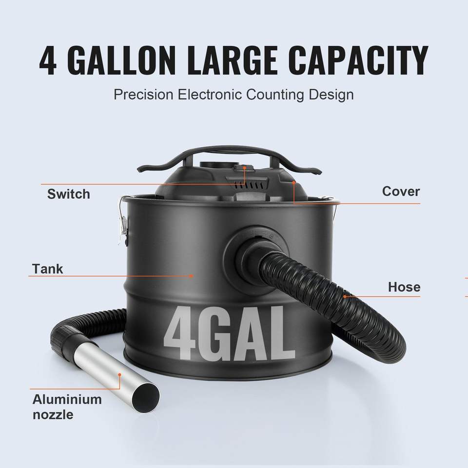 Aspirapolvere per Ceneri Potente da 1200W, 4 Galloni, per Caminetti a Pellet con Tubo Flessibile da 47,2 Pollici per Collettore di Ceneri
