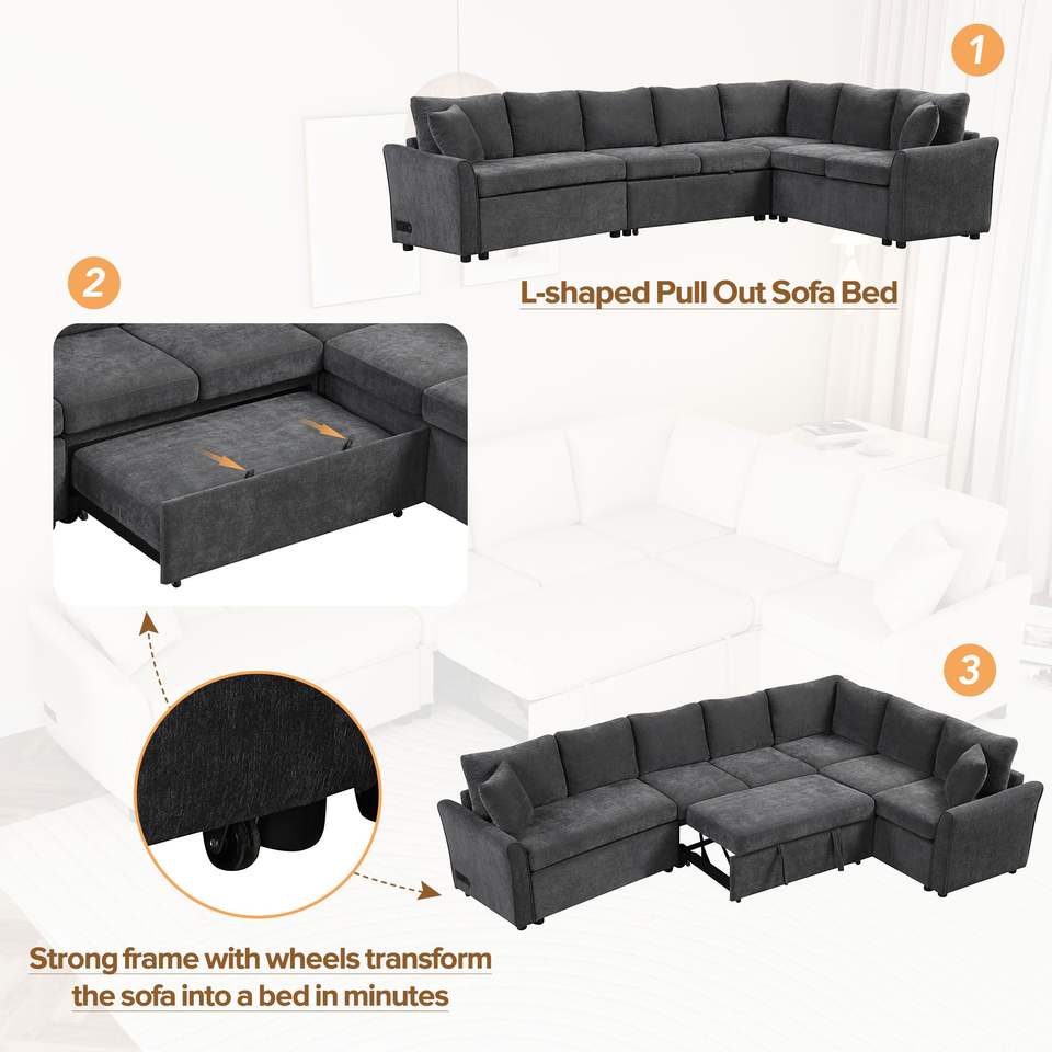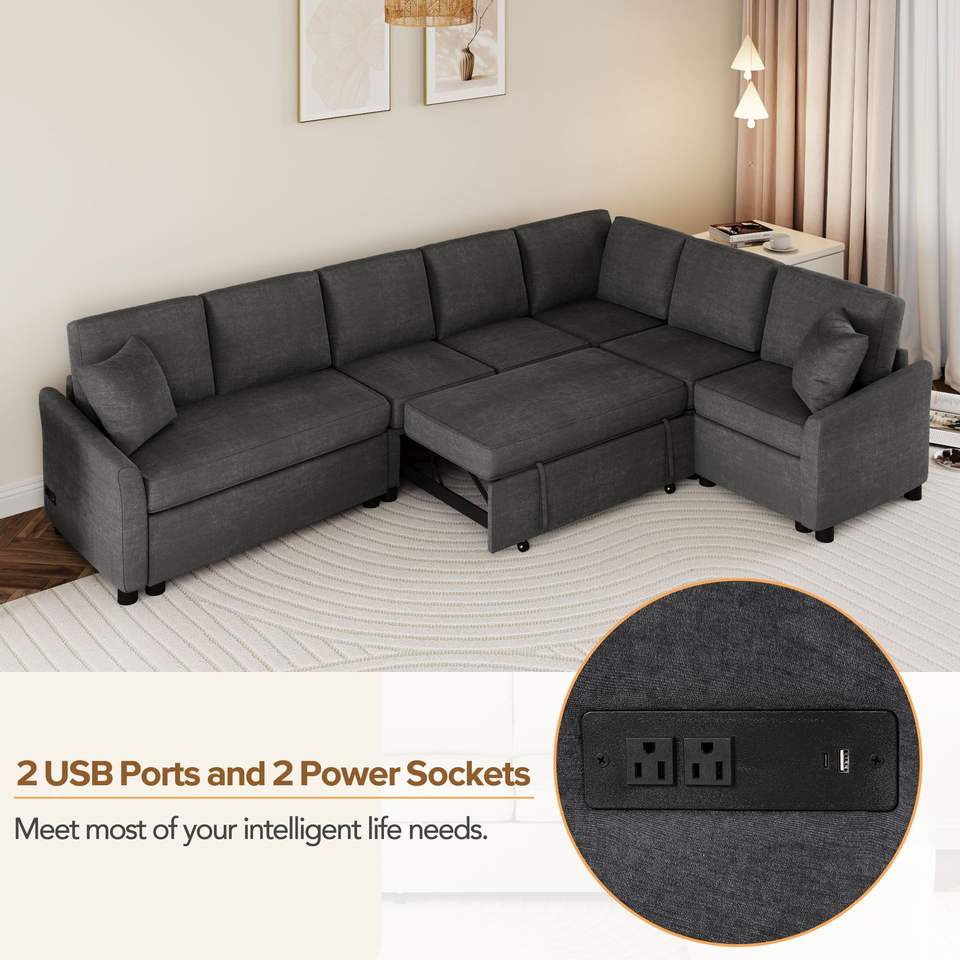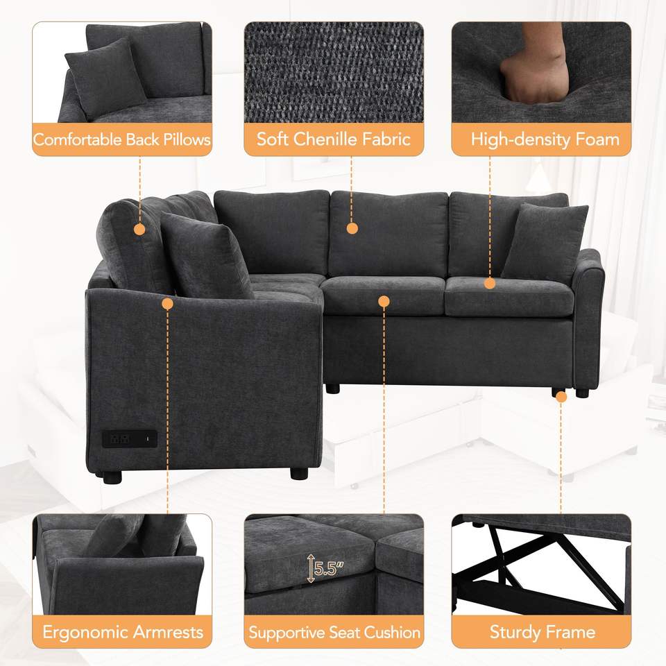 Divano letto a L convertibile da 317 cm con due cuscini, due porte USB e due prese di corrente