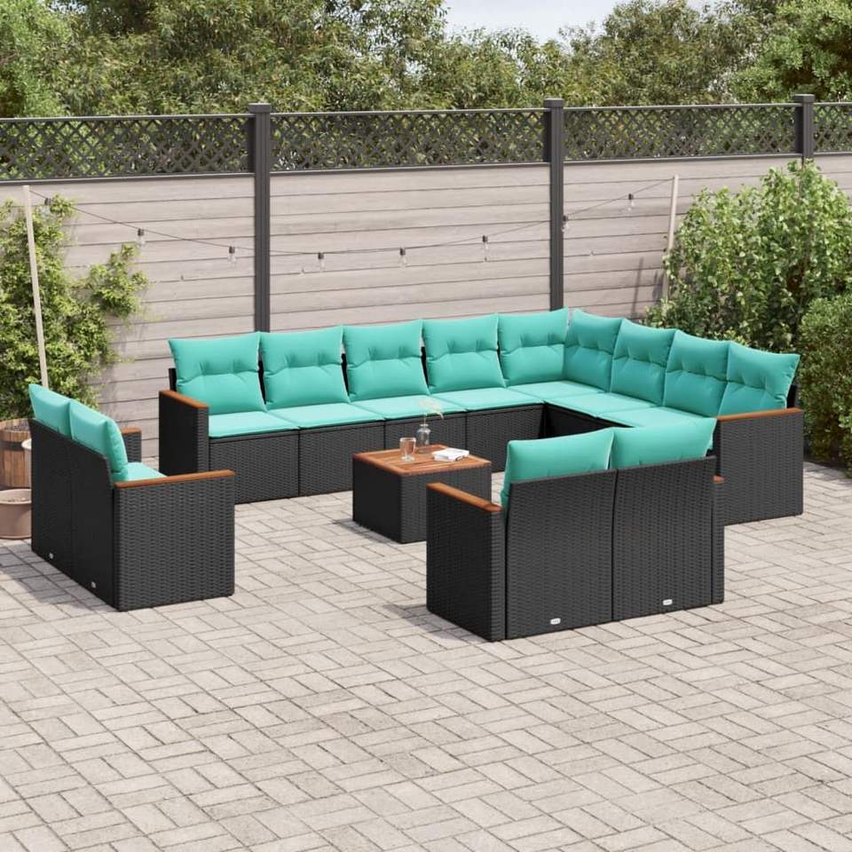 Set Divano da Giardino in Polyrattan Nero da 13 Pezzi con Cuscini per Arredamento da Esterno