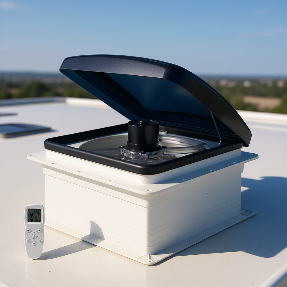 Ventilatore da Tetto 14 Pollici, Motore 12V DC, 10 Velocità, Telecomando, Pale in Plastica Bianca, 4 Pale, Montaggio a Tetto