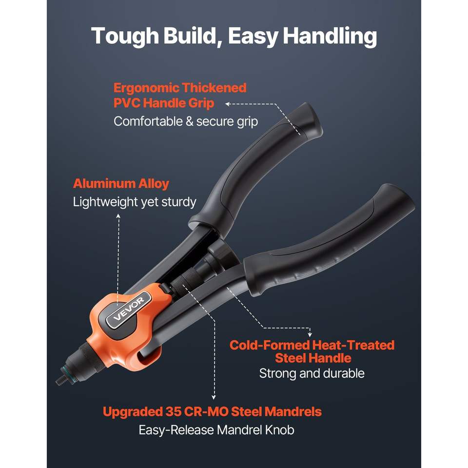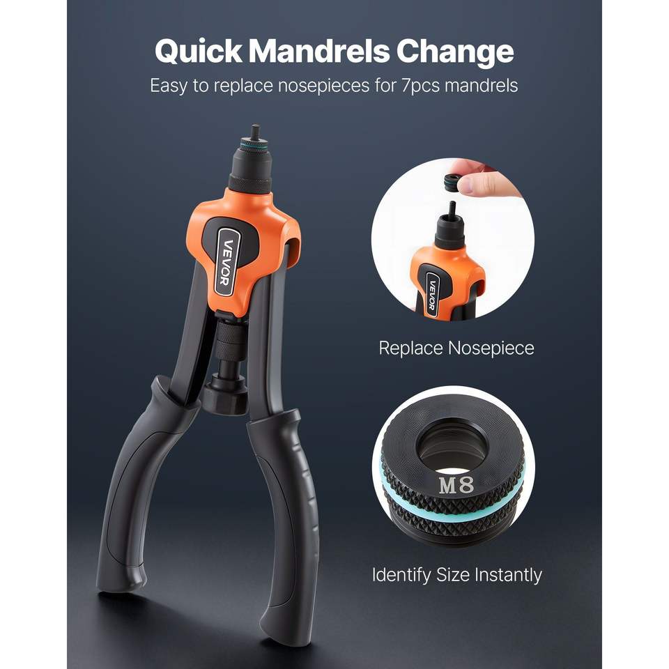 Kit di Utensili per Rivetti a Due Mani da 14 Pollici con 7 Mandrini e 70 Dadi, Misure Metriche e SAE M6 M8 M10 10-24 1/ con Rivetti a Dado