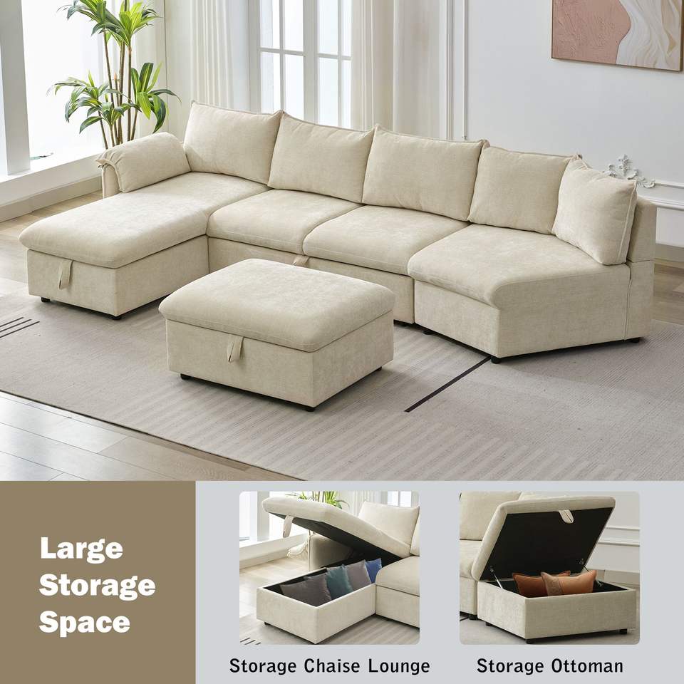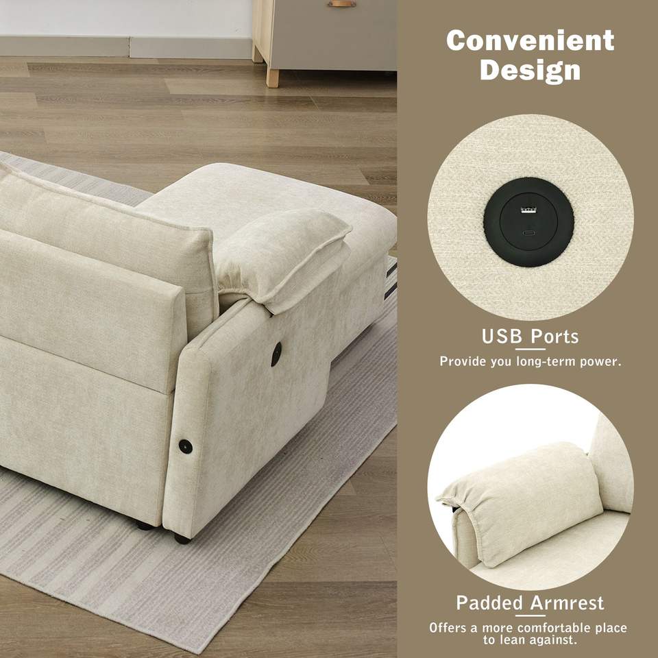 Divano Componibile a L da 370 cm con Letto Estraibile, Pouf Contenitore Mobile e Due Porte USB, Chaise Longue con Vano Portaoggetti