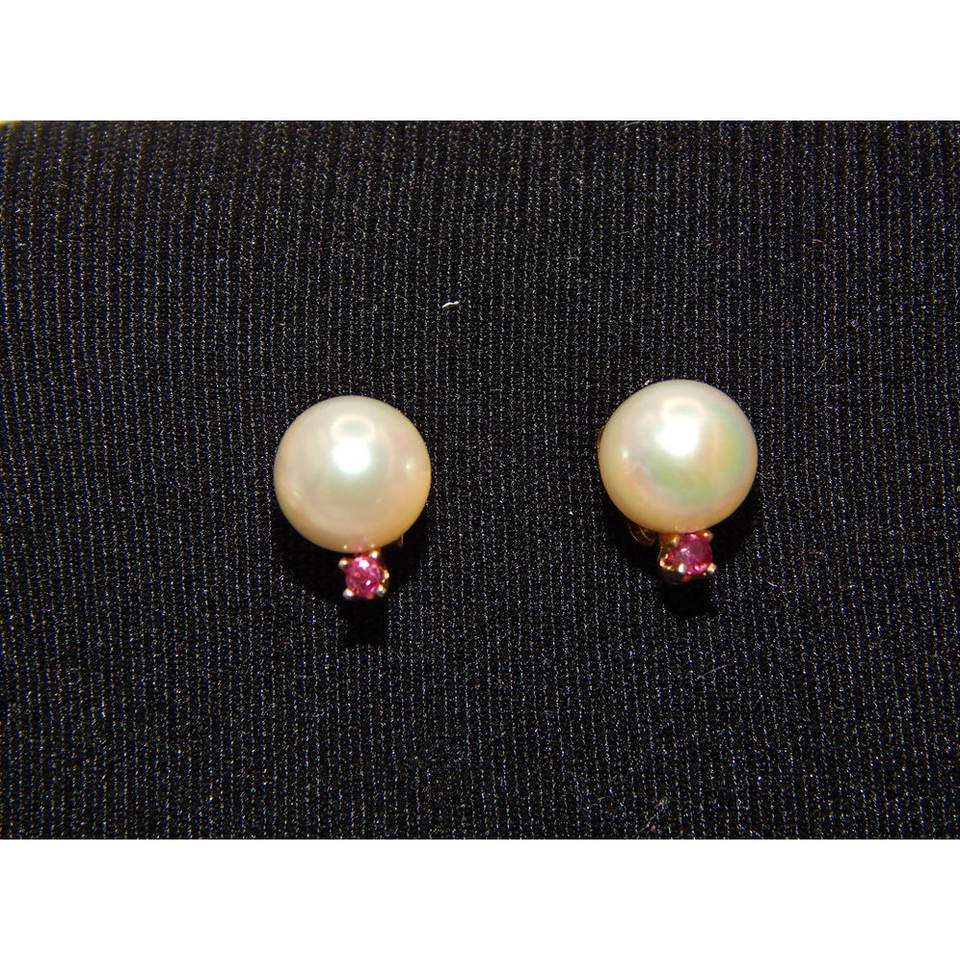 14K Gold Cultured Pearl Earrings with Ruby Satelite