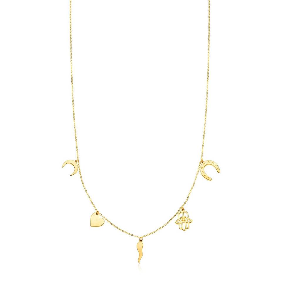 Collana a catena sottile in oro giallo 14K da 18 pollici con ciondoli lucidi e bracciali a maglie