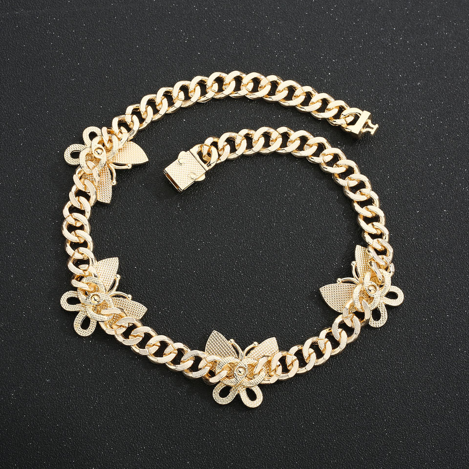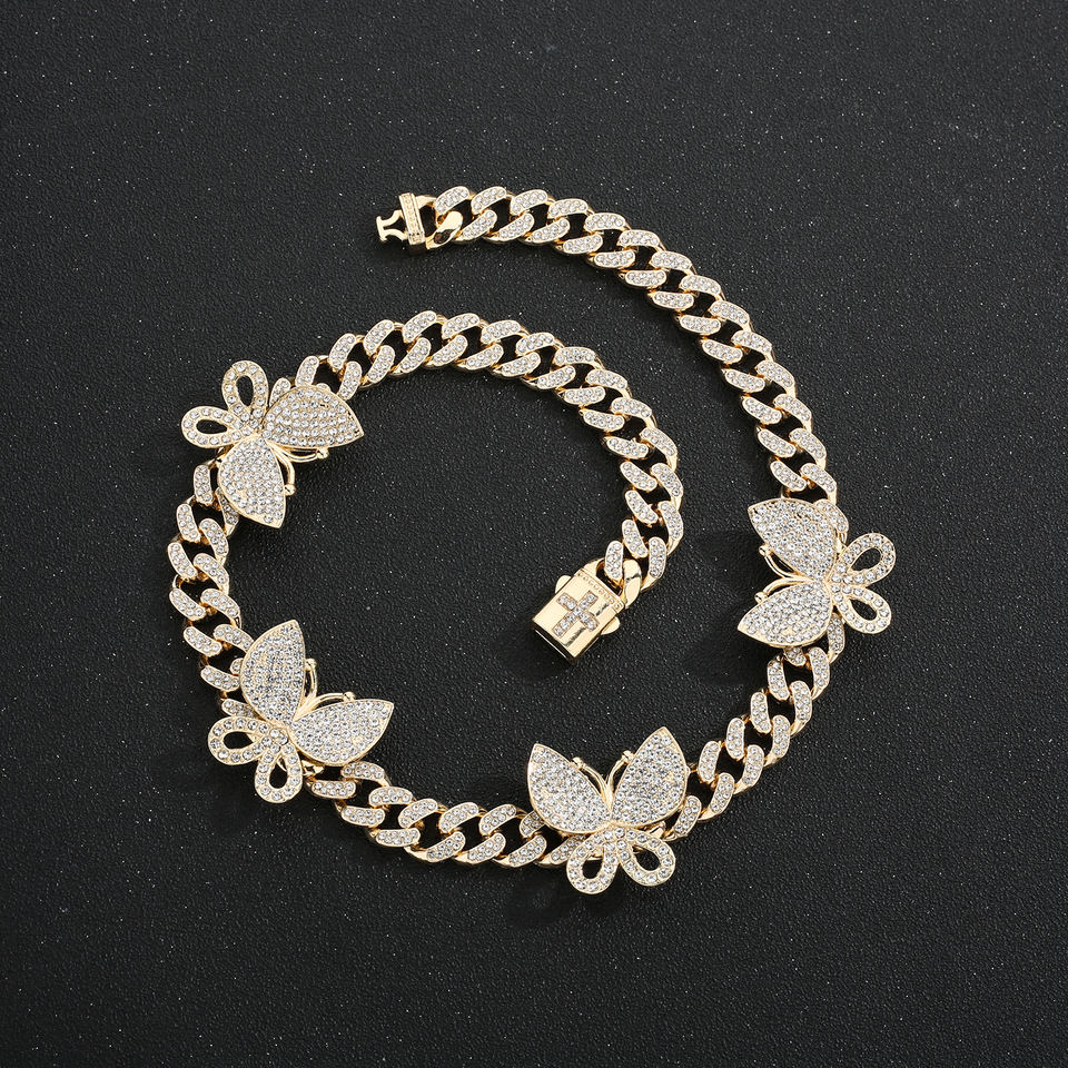 14k Gold Plating Men's Hip Hop Rap Accessories Hiphop Cuban Diamond Inlaid Butterfly Bracelet Gold Male Necklace
