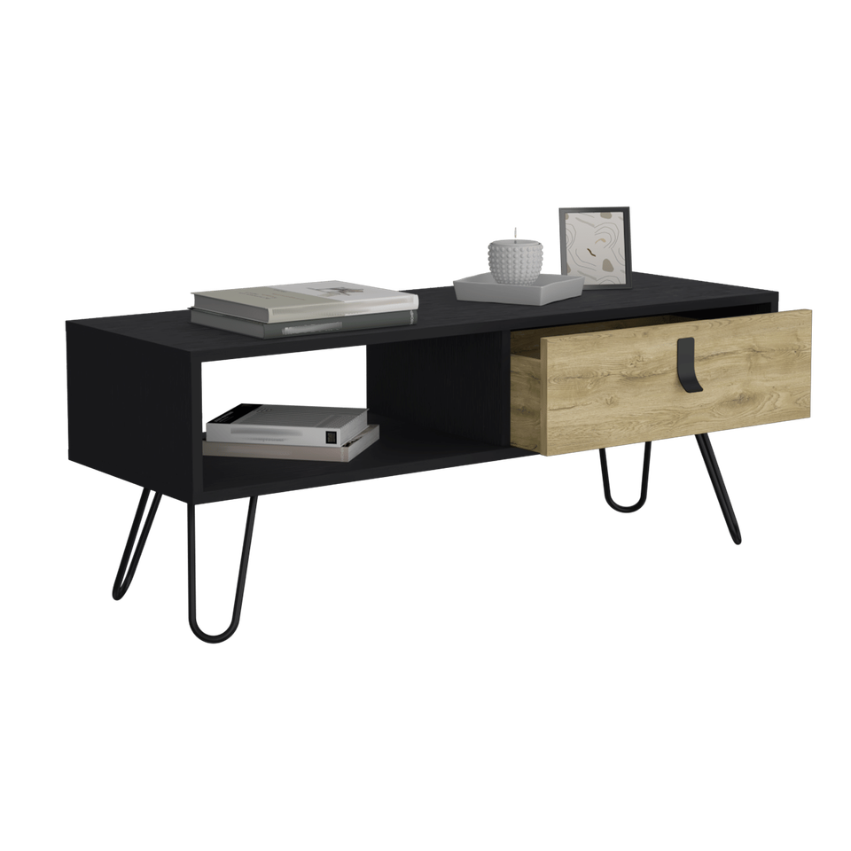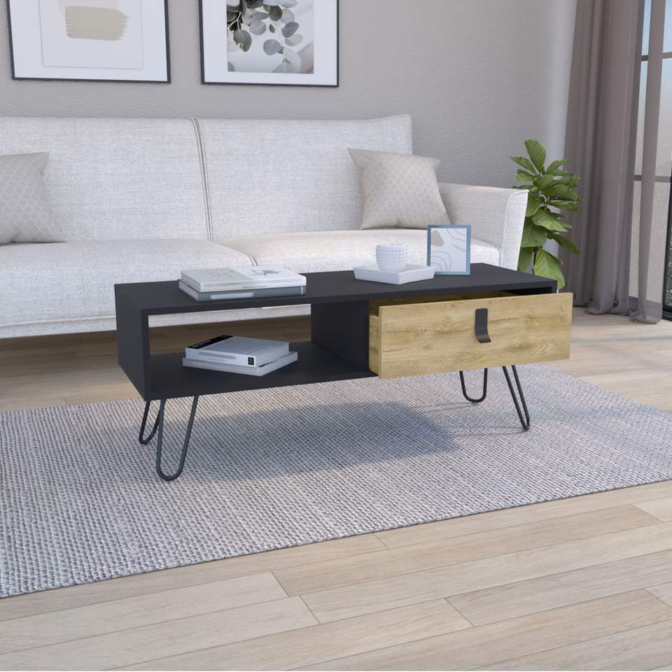 Tavolino da Caffè Rettangolare di Design 15 Pollici in Legno Macadamia 4 Gambe in Metallo Vintage 1 Divisorio Verticale per Libri 1 Cassetto Colore Bianco