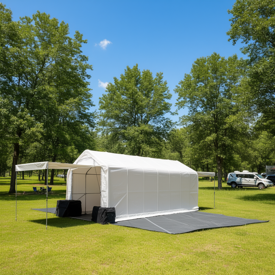 D0100XU642A Motorhome Storage Shelter 15 X 35 Ft PVC Fabric Front Roll-Up Door Waterproof RV Exterior Cover
