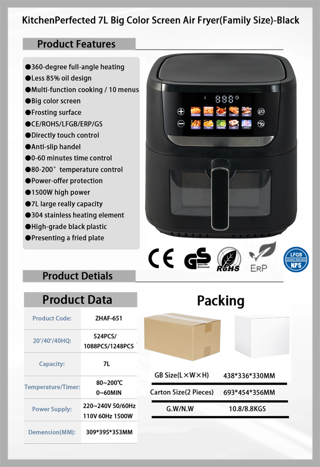 Schermo a colori 1500W Multi-funzione 10 menu preimpostati 7L grande capacità visualizzabile friggitrice ad aria finestra per uso domestico CE/ROHS/GS/LFGB