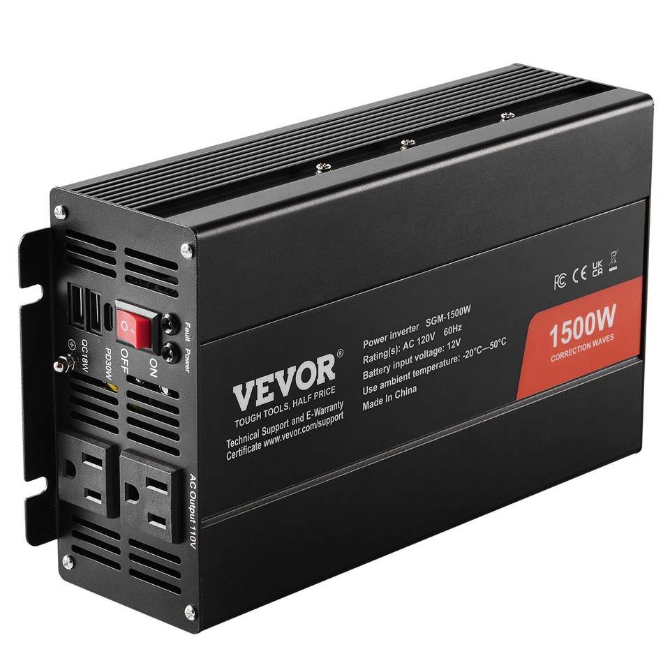 Inverter di Potenza a Onda Sinusoidale Modificata 1500W, da DC 12V a AC 120V, 2 Prese AC, 2 Porte USB e 1 Porta Type-C con 6 Fusibili di Ricambio