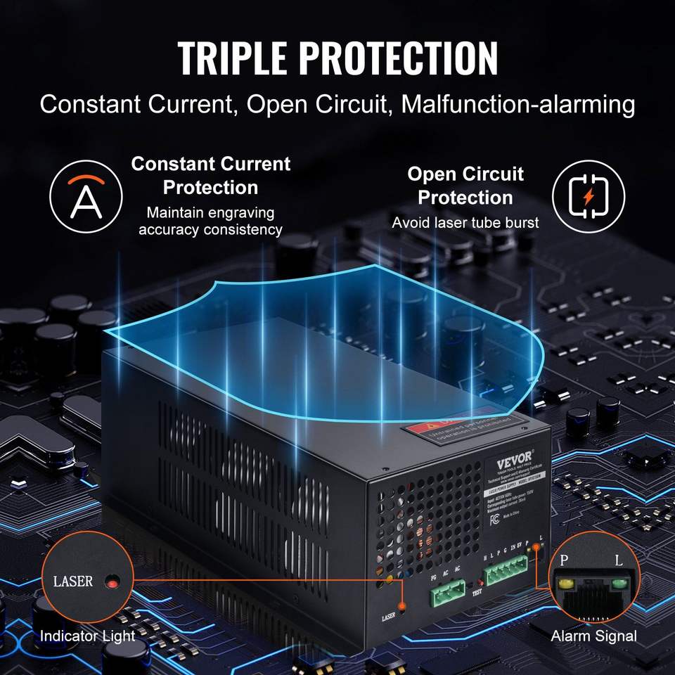 Alimentatore laser CO2 da 150W con protezione a corrente costante, protezione da circuito aperto, dissipazione rapida del calore, accessori per alimentatori.
