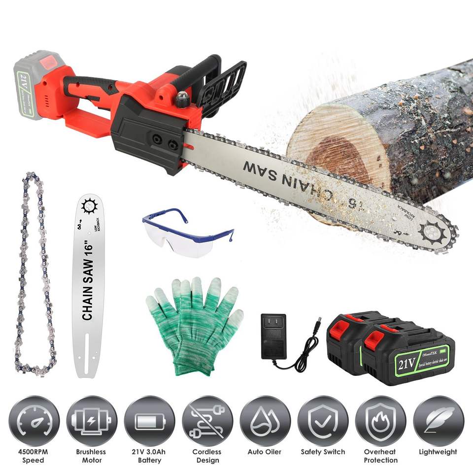 Motosega a Batteria da 16 Pollici, Motore Brushless 850W, 4500 Giri/min, Velocità di Taglio Rapida, Lubrificazione Automatica, Protezione dal Surriscaldamento
