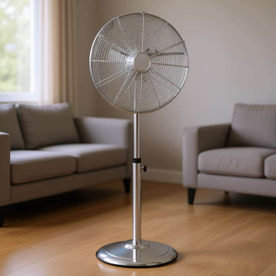 Ventilatore a piantana oscillante industriale da 16 pollici in argento, a 3 velocità, regolabile in altezza, per raffreddamento domestico