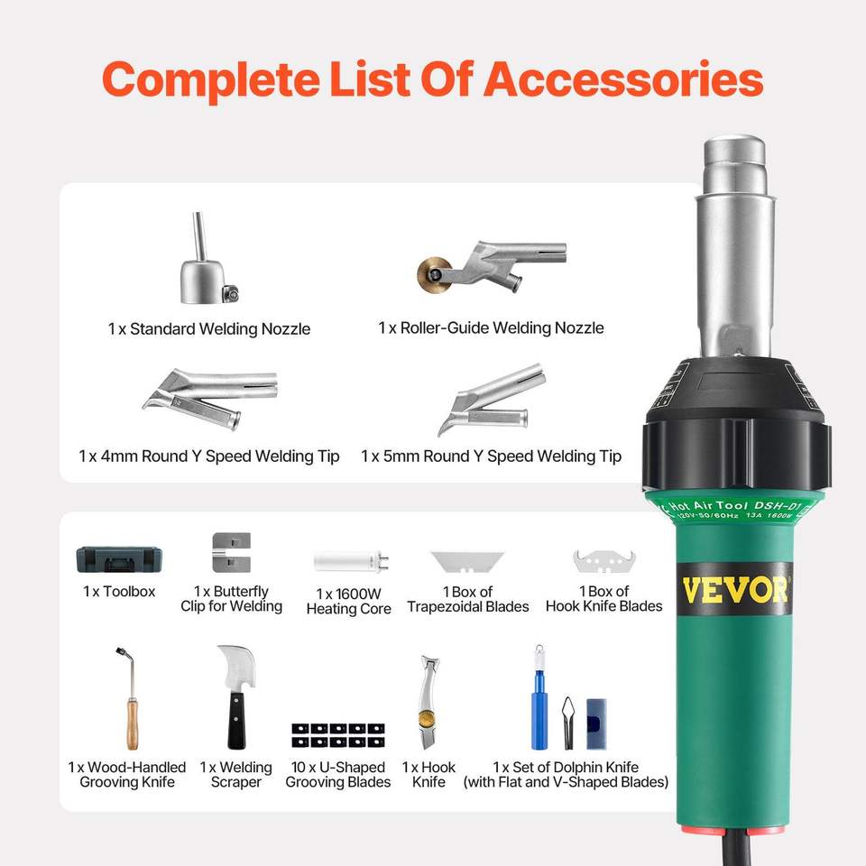 1600W Hot Air Plastic Welder PVC TPO Vinyl Heat Gun Torch with 14 Accessories