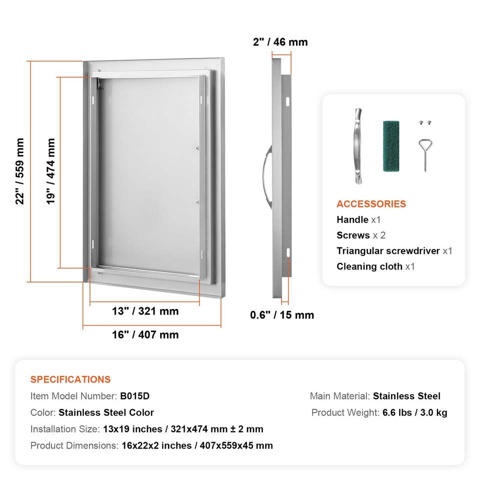Maniglia verticale per porta da cucina esterna a incasso in acciaio inossidabile 16W x 22H pollici, per porta singola di accesso BBQ, accessori per mobili