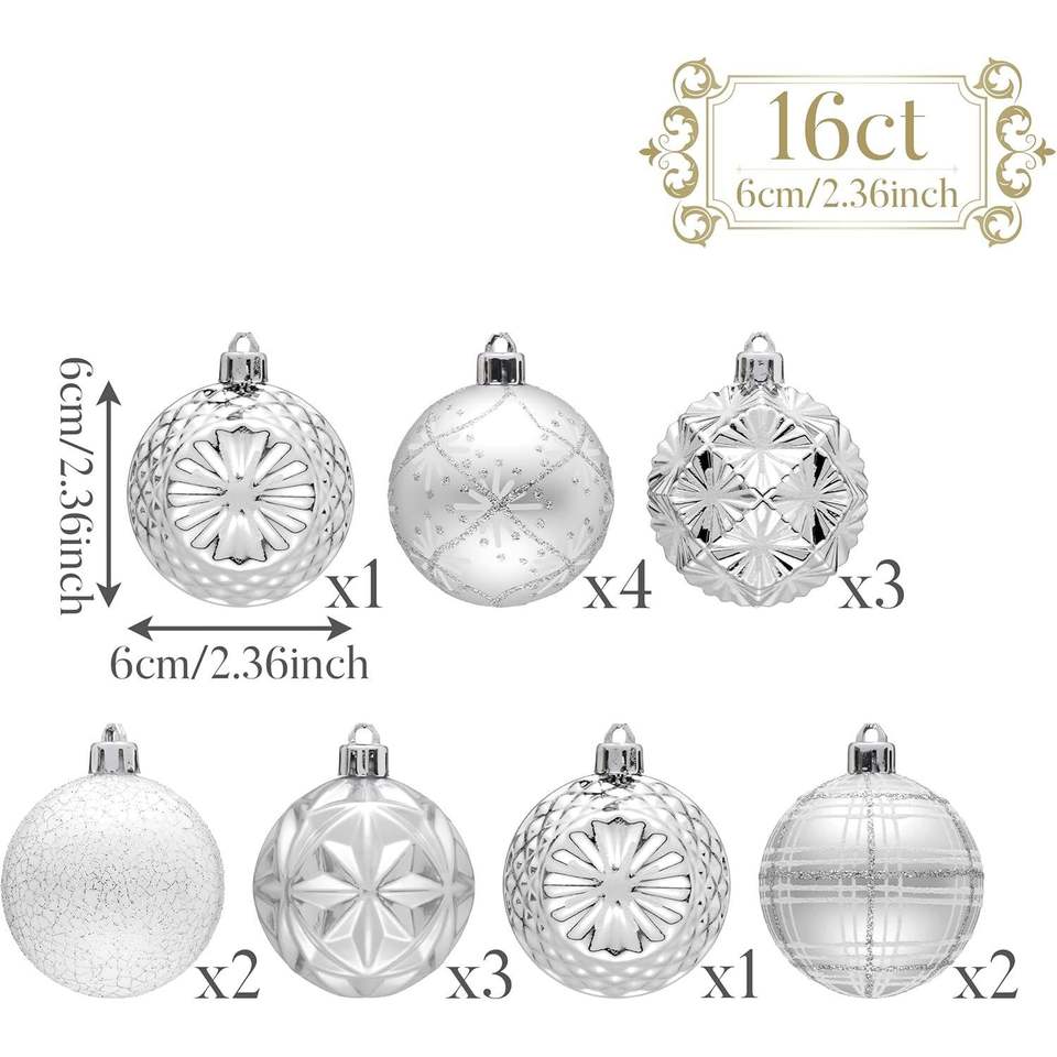 Decorazioni Natalizie di Lusso da 16 Pezzi, Palline Appese Bianche e Argento Infrangibili da 2,36 Pollici per Albero di Natale