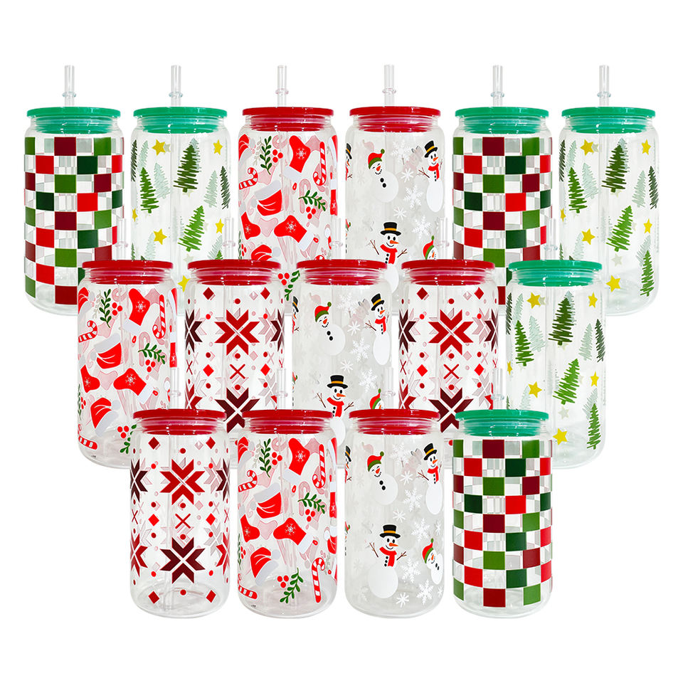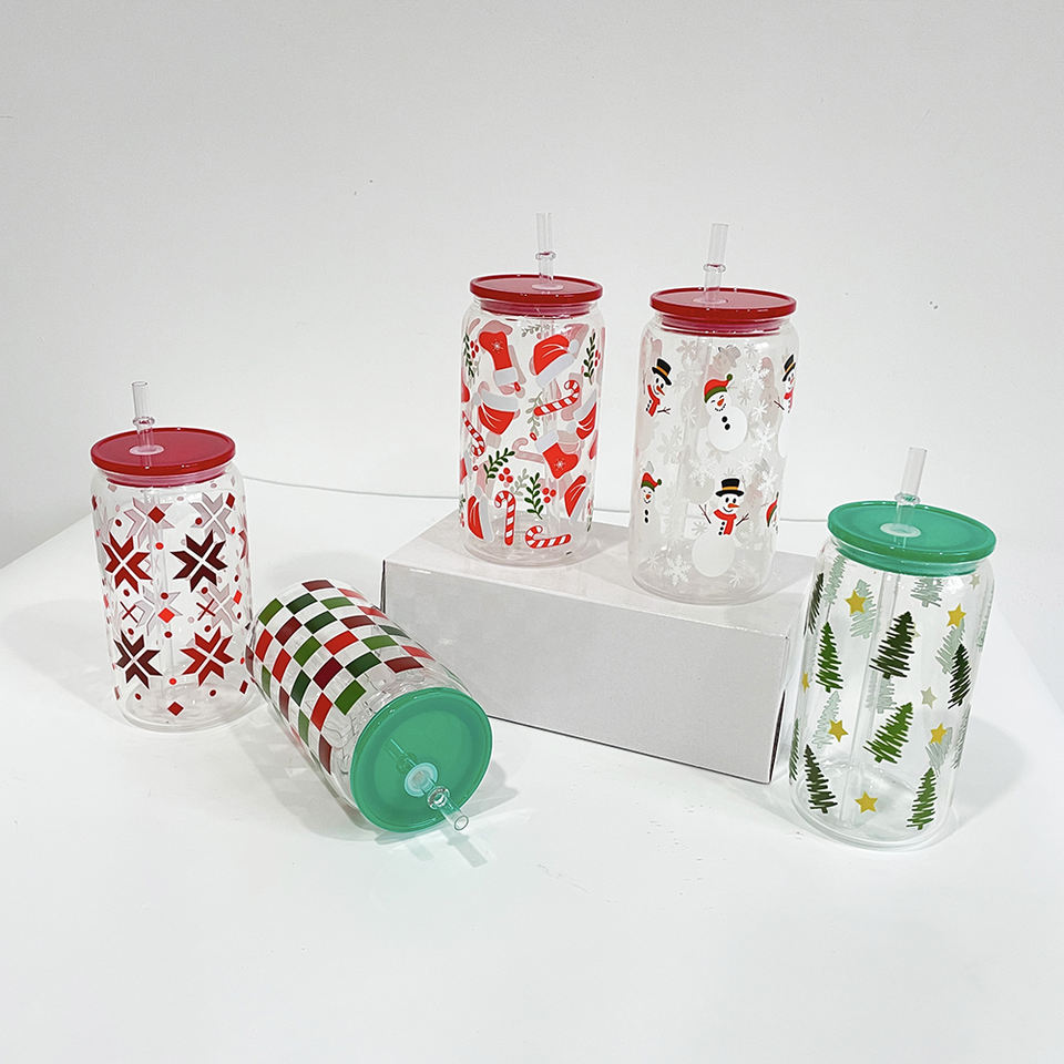 16oz natale Uv stampato Soda trasparente in vetro bevanda fredda tazza di caffè elegante a forma di bicchieri con coperchi in plastica pp