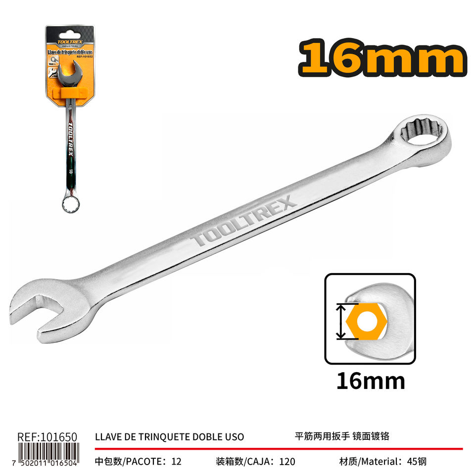 Chiave Combinata Tooltrex 16mm a Doppia Estremità, Finitura Cromata a Specchio, Misurazione Metrica per Riparazioni Industriali e Fai-da-Te
