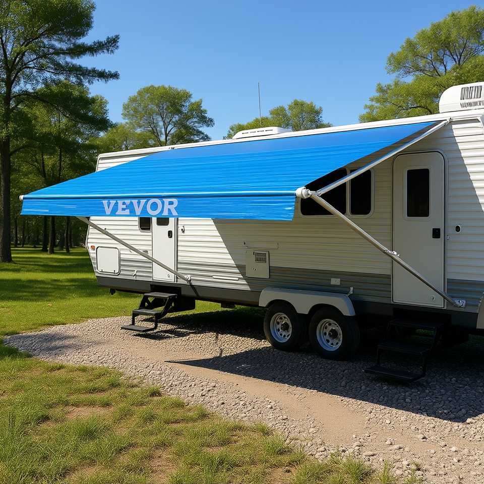 Camper Patio Awning 18 Ft Ocean Blue Vinyl Manual Retractable Aluminum Frame Durable Replacement Canopy Model D0100HPU37G
