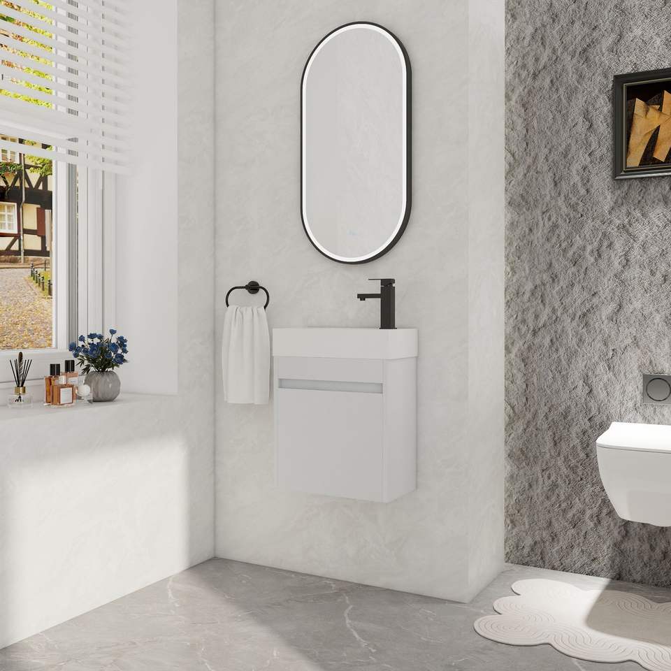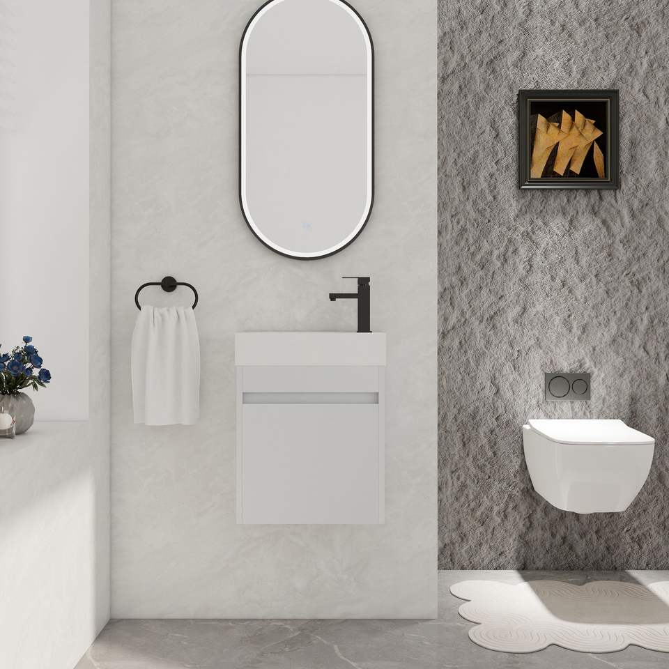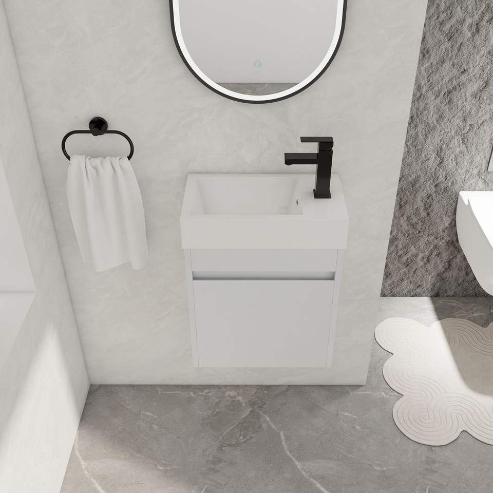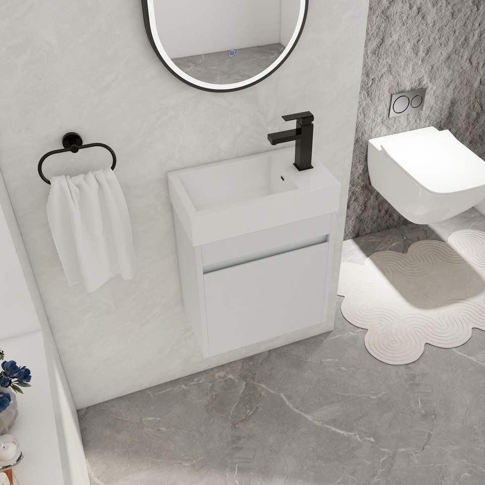 Mobile bagno sospeso da 18 pollici con lavabo in resina bianca e anta con chiusura ammortizzata