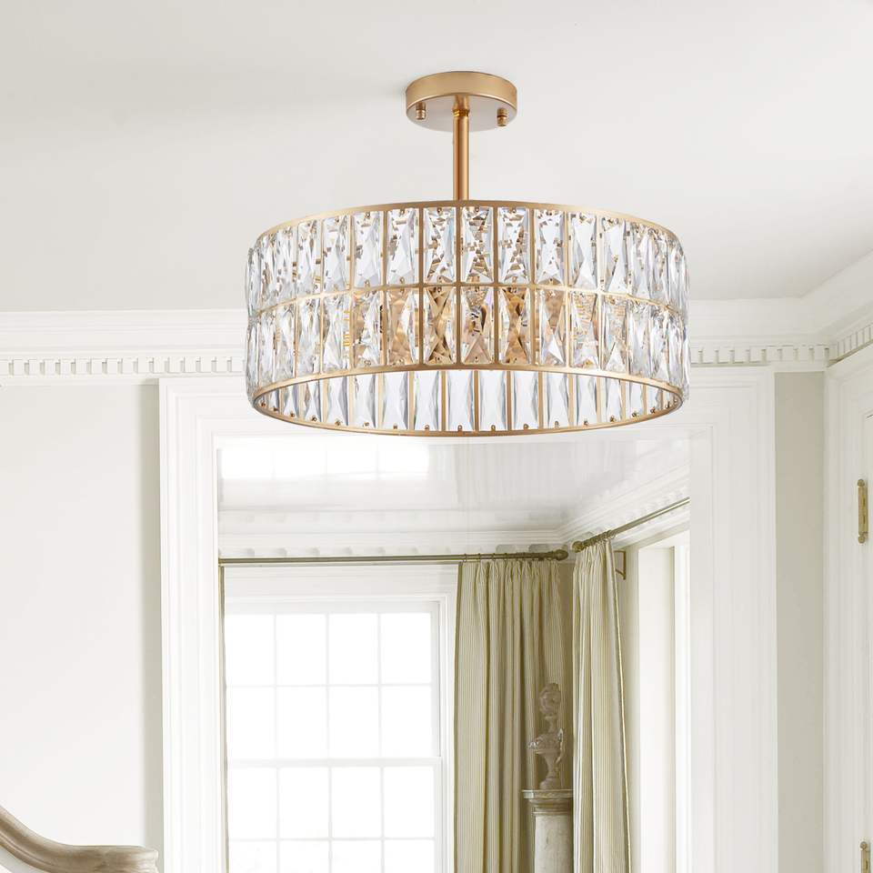 18-Inch Golden Modern Crystal Drum Pendant Light 6-Light Fixture with Metal Frame for Living & Dining Room
