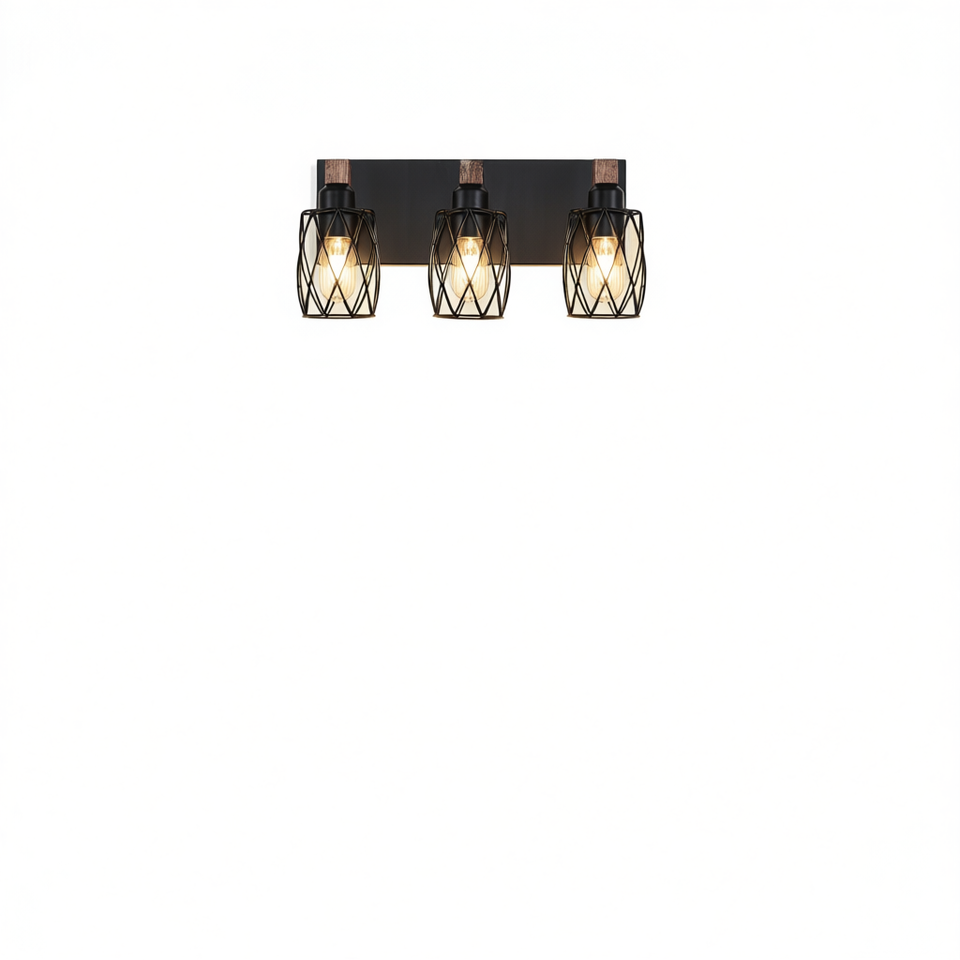 Applique da Parete Industriale Vintage a 3 Luci Nera con Gabbia e Dettagli in Legno di Noce, Design in Metallo per Bagno