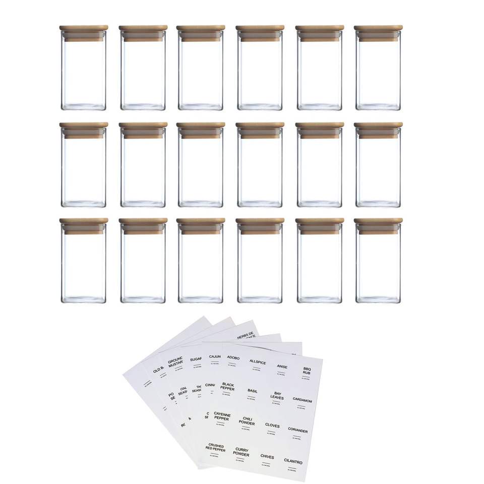 Set di 18 Barattoli Quadrati in Vetro e Bambù da 240ml per Spezie, Eleganti Contenitori per Condimenti