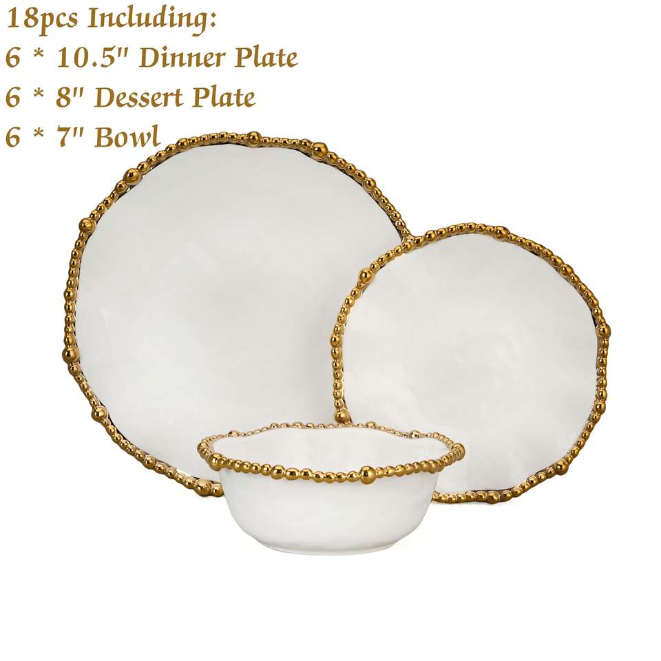 Servizio di Piatti da 18 Pezzi Artigianale in Ceramica Bianca e Oro, Stoviglie Senza BPA con Bordo Dorato a Perline, Piatti Piani e Ciotole