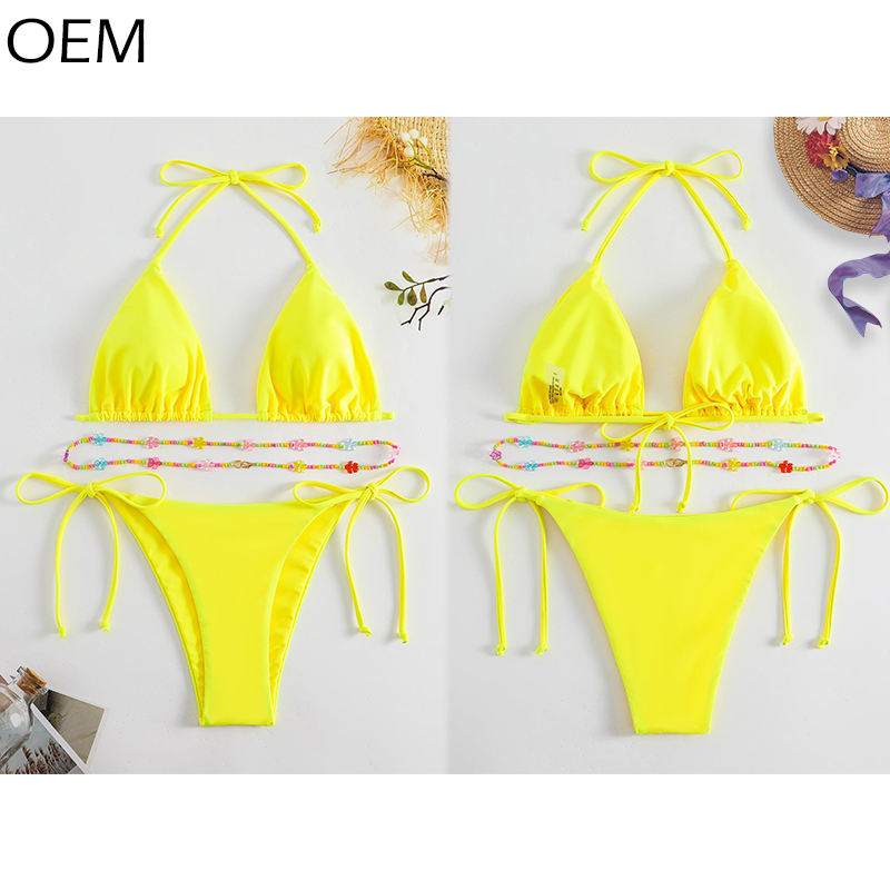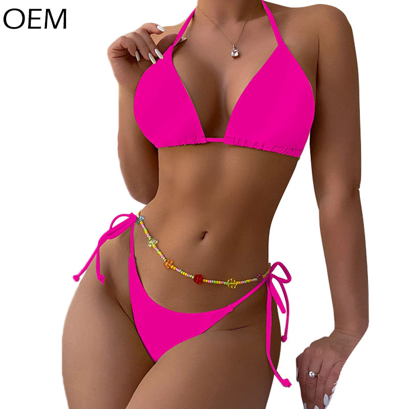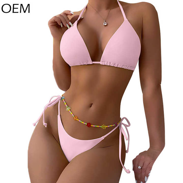 18 Teen Xxx Hot Sexy Bikini Young Girl Swimwear 2 Piece Set Halter Tie Side Triangle Swimsuits With Candy Color Waist Chain