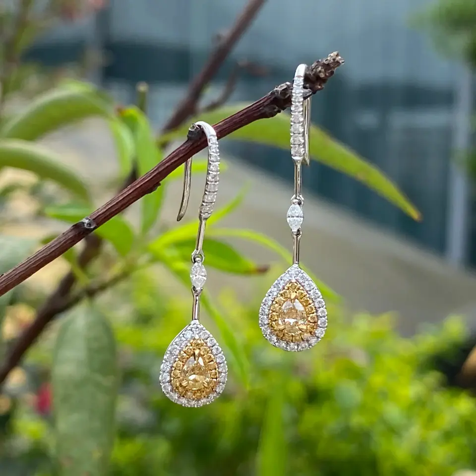 Orecchini in Oro 18K con Diamanti Naturali Gialli Taglio a Pera e Accenti di Diamanti Bianchi