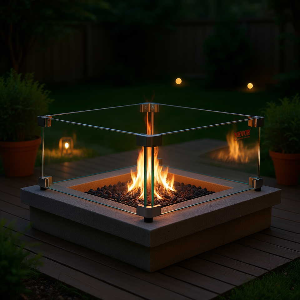 19 X 19 X 7 Inch Clear Tempered Glass Wind Guard Square Gas Fire Pit Table 0.31 Inch Thick Hard Corner Bracket Feet Model