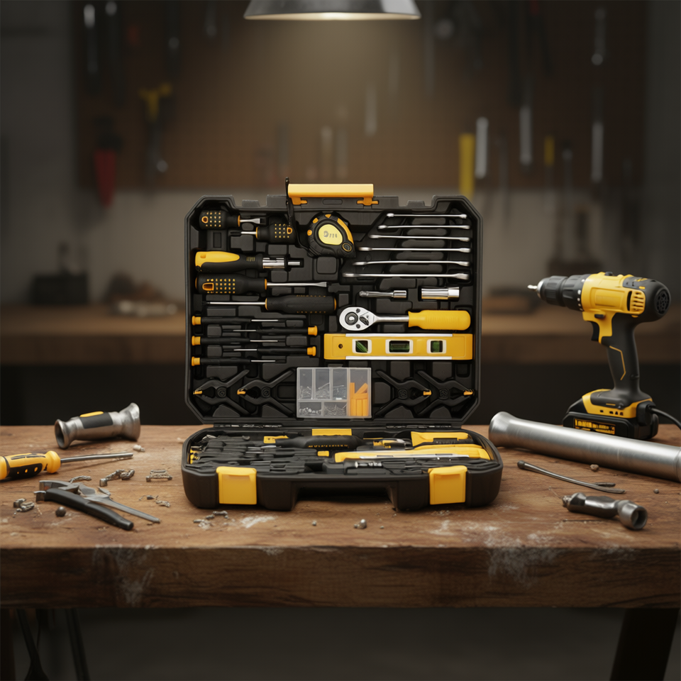 Set di attrezzi nero e giallo da 198 pezzi con chiavi combinate per la manutenzione domestica