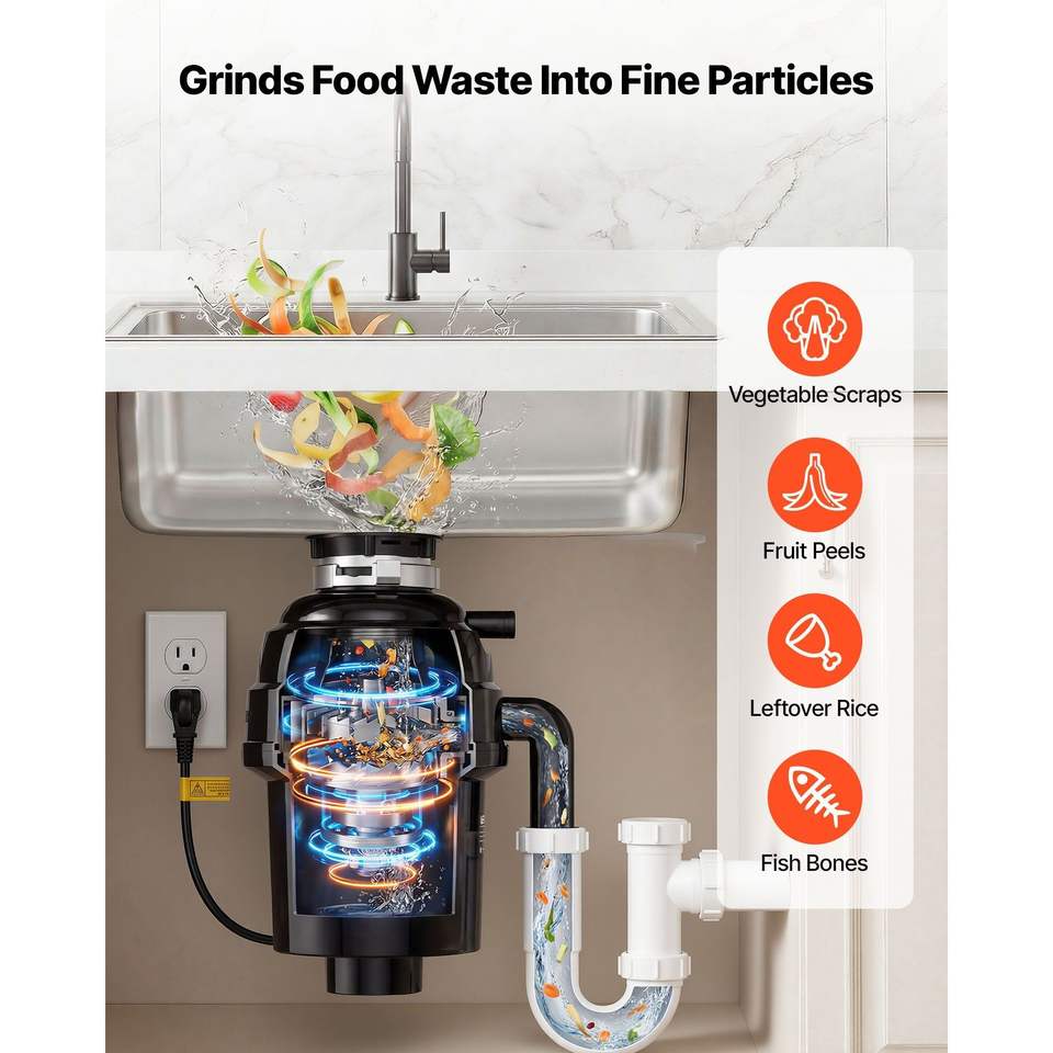 Trituratore di rifiuti alimentari da cucina con motore DC da 1HP 3500RPM a alimentazione continua, con collegamento EZ per la triturazione dei rifiuti.