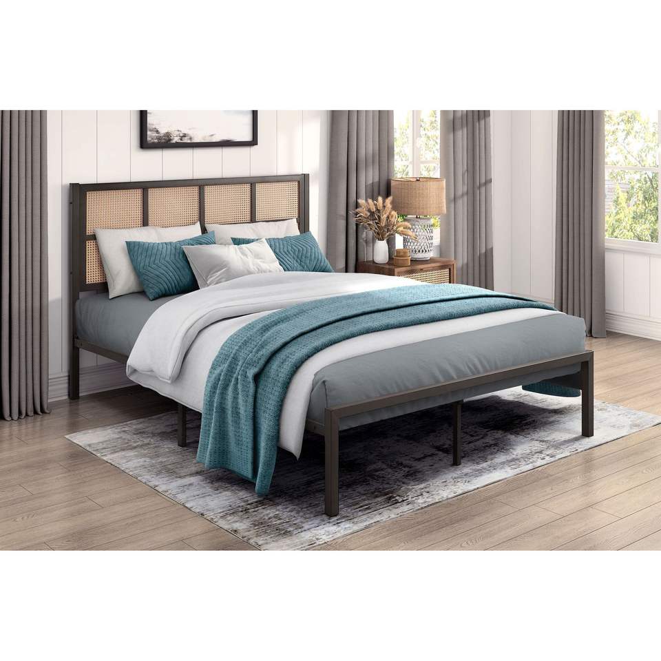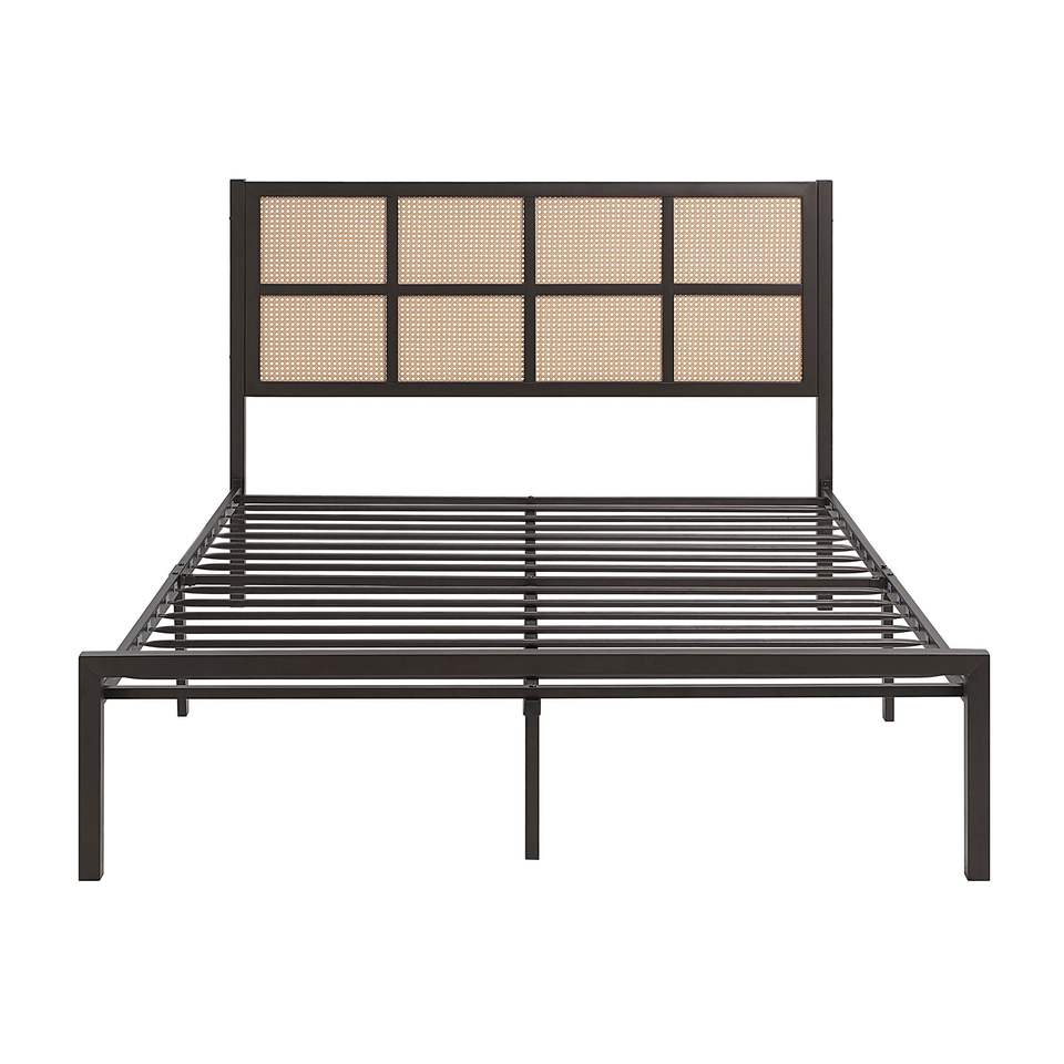 Letto matrimoniale con piattaforma in metallo, finitura bronzo scuro, testiera con pannelli in finto canna, stile casual costiero, mobile letto con contenitore