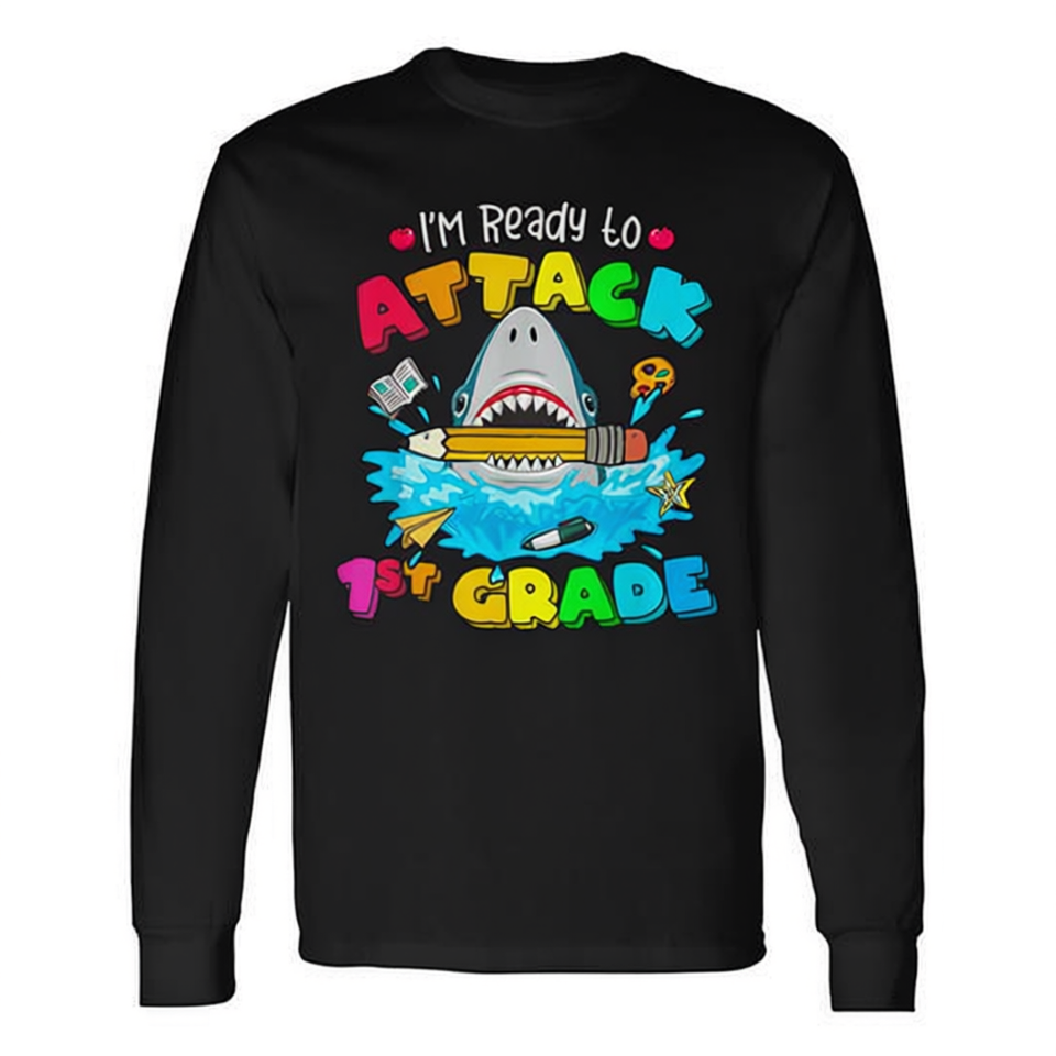 Maglietta a Maniche Lunghe per Bambini di Prima Elementare con Design Squalo Pronto all'Attacco, Tema Ritorno a Scuola, Abbigliamento Promozionale