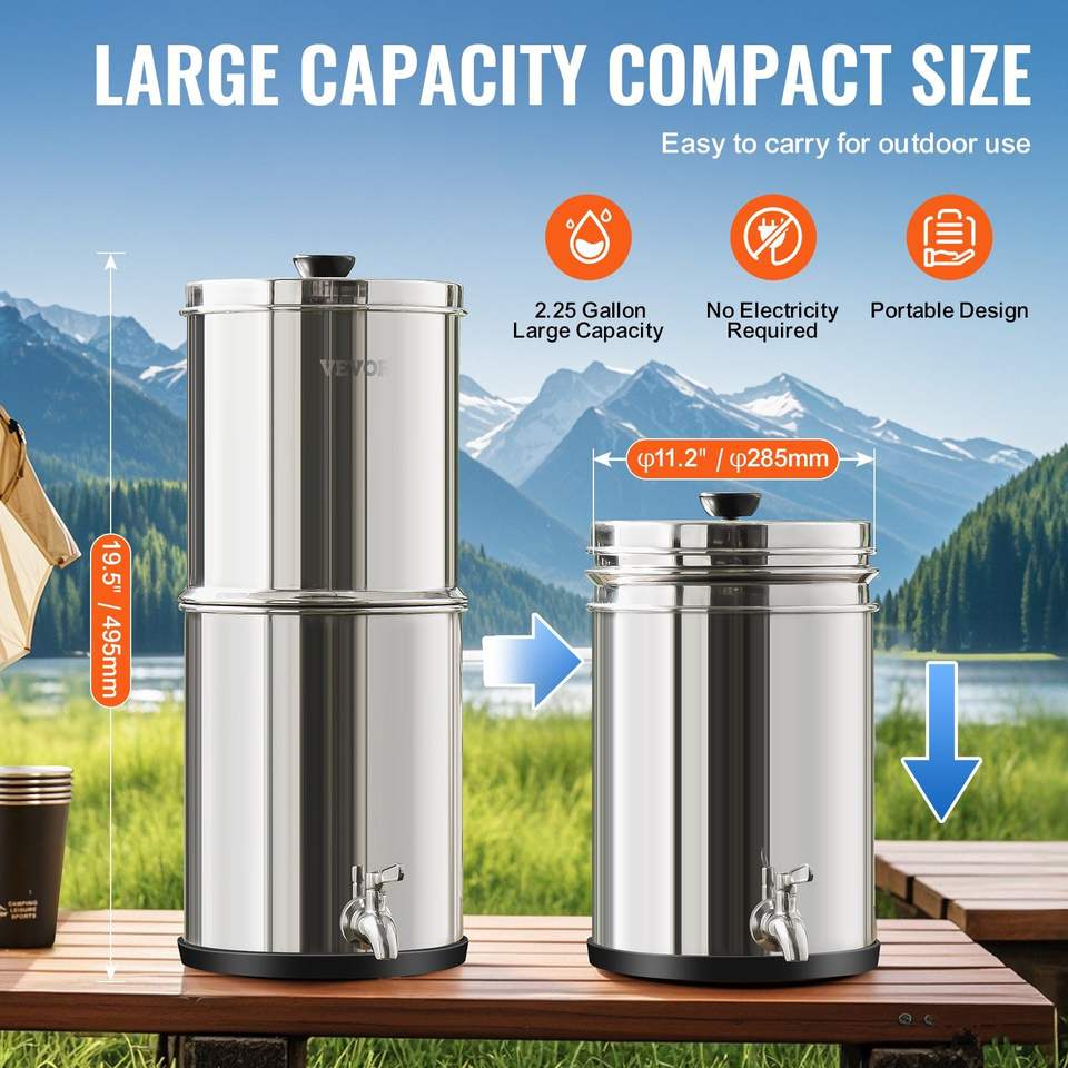 Sistema di filtraggio dell'acqua a gravità da 2,25G in acciaio inossidabile 304 per piano di lavoro, efficace sistema di filtrazione dell'acqua da esterno per piano di lavoro