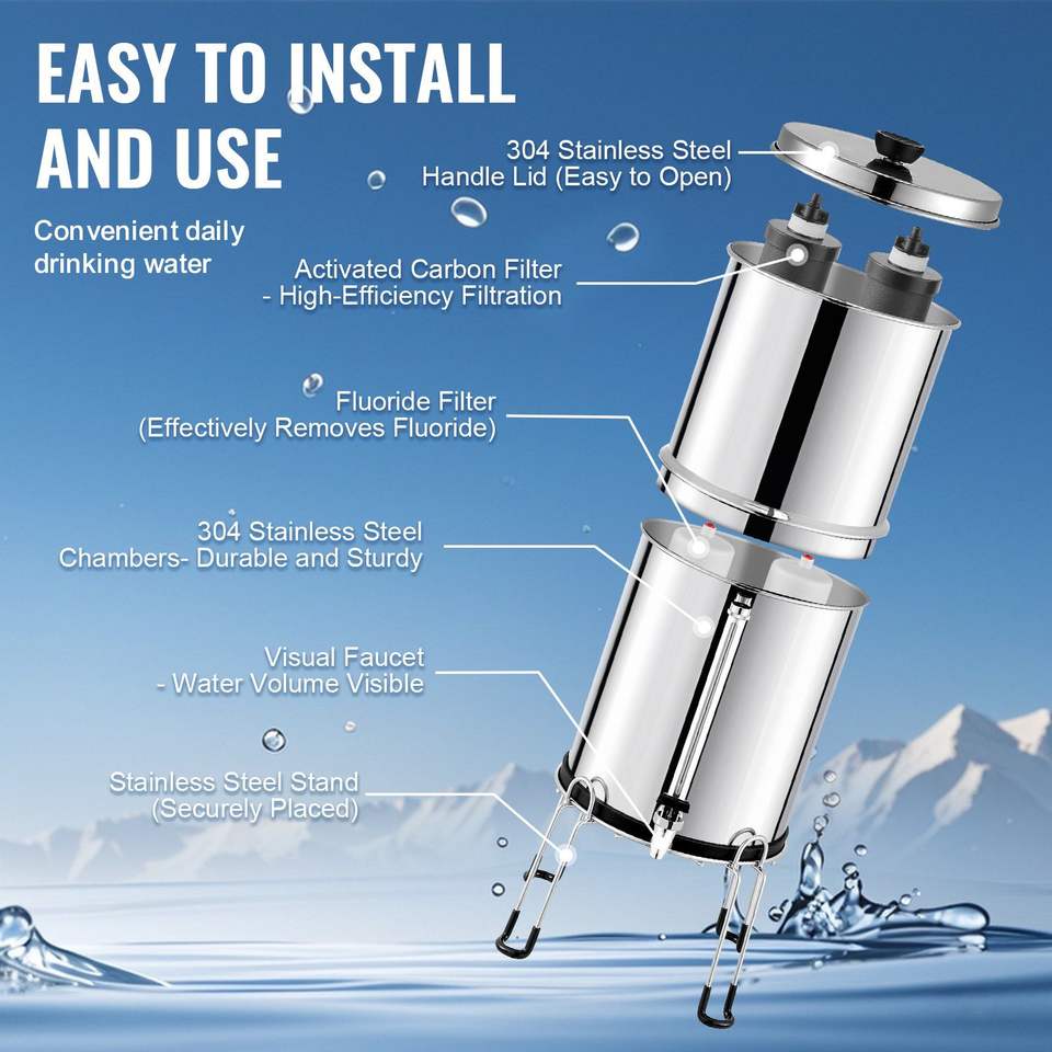 Sistema di filtrazione da banco in acciaio inossidabile 304 da 2,25G, sistema di filtraggio dell'acqua a gravità, filtri per acqua da esterno, riduce il piombo del 99%