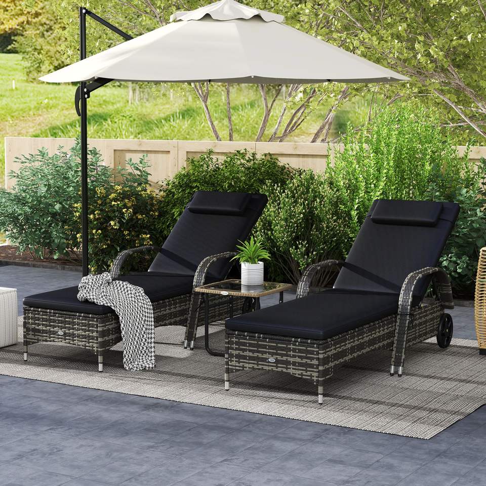 2 Black Outdoor Rolling Chaise Lounge Chairs with Cushion Headrest Armrests and Wheels Reclining Sun Loungers