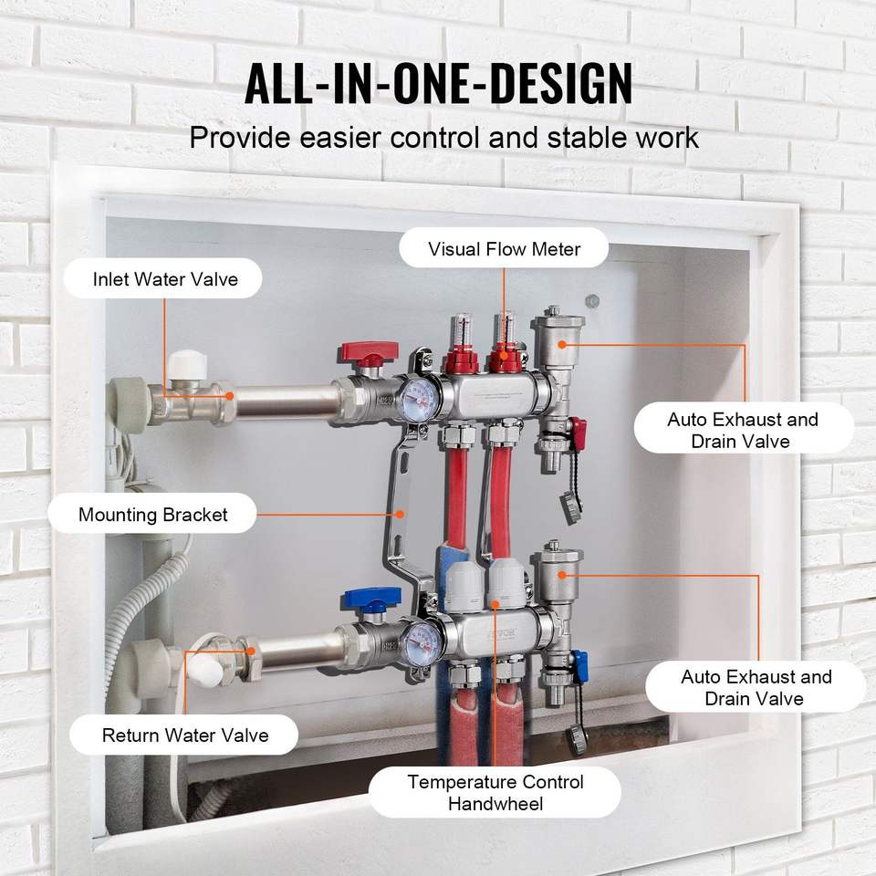 Collettore a 2 Vie in Acciaio Inossidabile per Tubi PEX da 1/2 Pollice per Sistemi di Riscaldamento Radiante Idronico a Pavimento HVAC