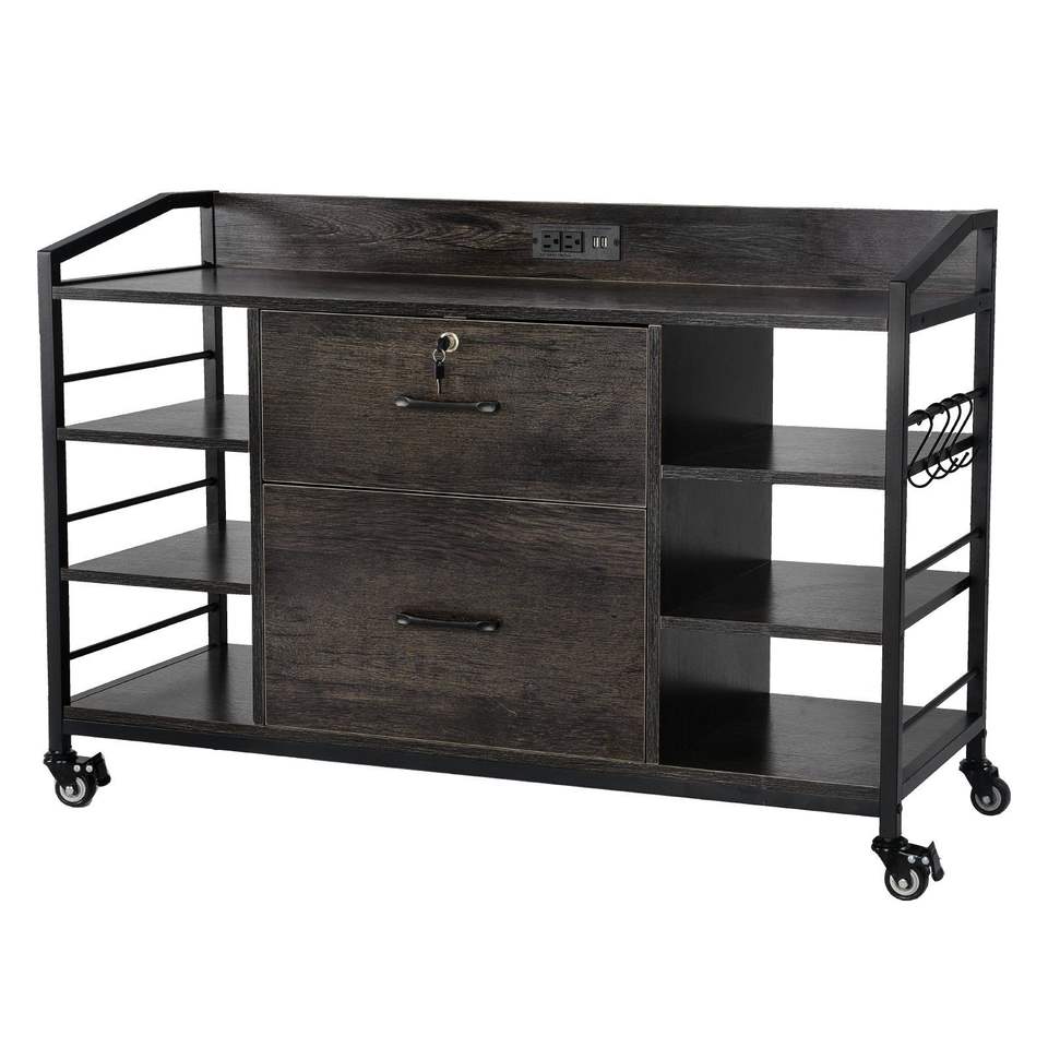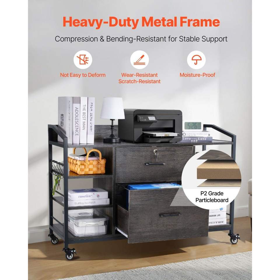 Armadio Archivio in Metallo a 2 Cassetti con Serratura, 6 Ripiani Aperti, Mobile per Archiviazione in Legno, Armadio Laterale con 6 Ripiani Aperti