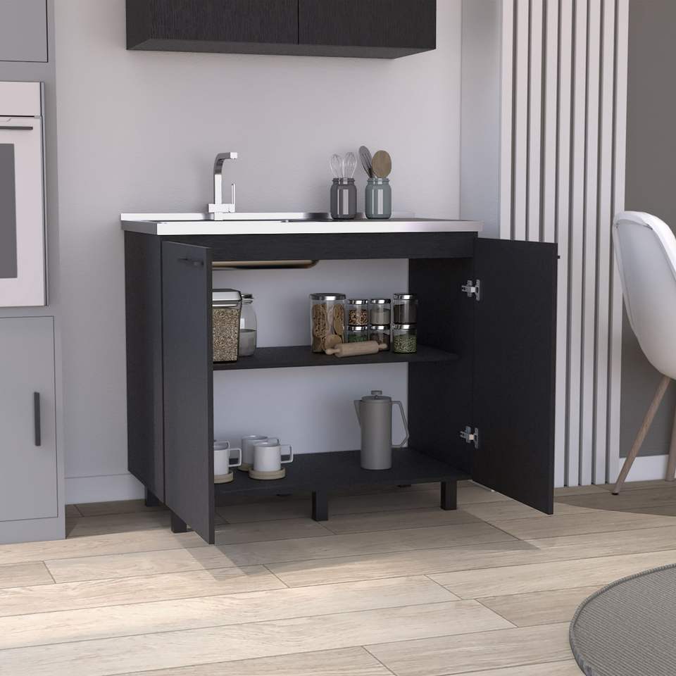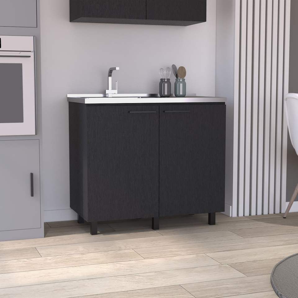 2 Mobili Base Indipendenti in Acciaio Inossidabile con Piano di Lavoro Nero e 2 Ante per Uso in Cucina