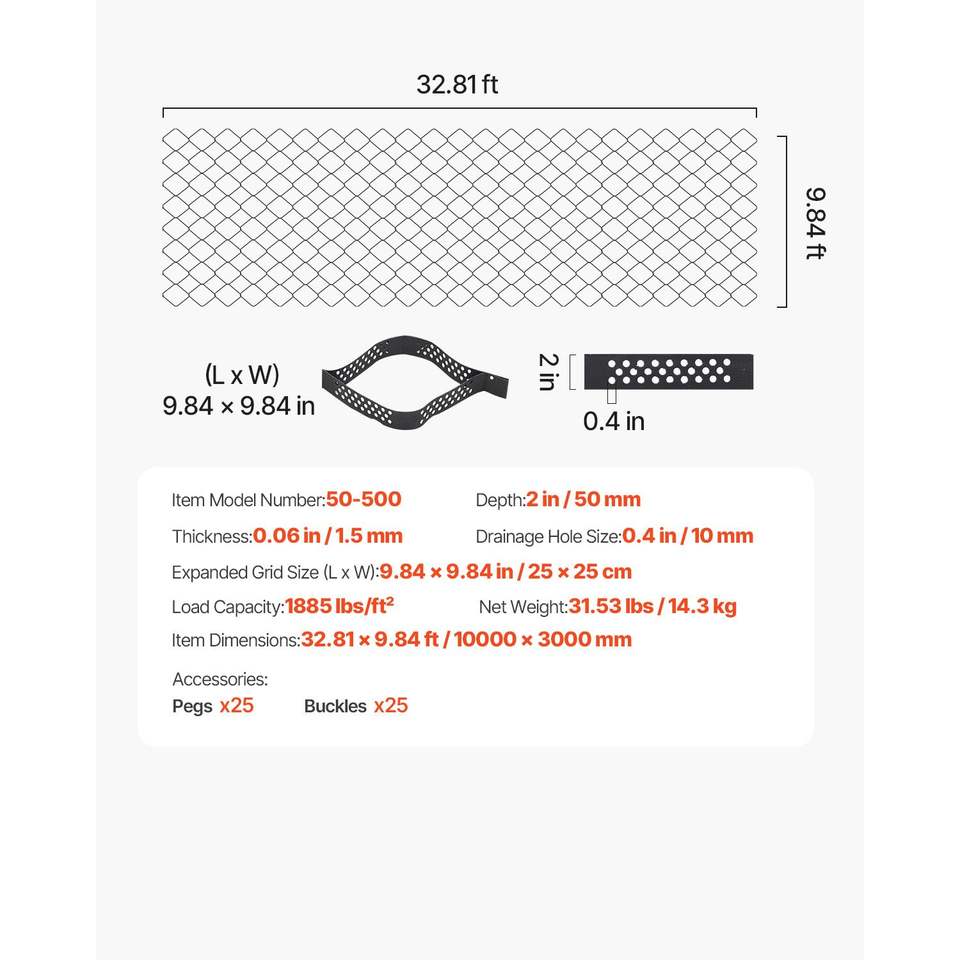 Griglia per Ghiaia Profondità 2 Pollici 32.81 X 9.84 FT 1880 LBS Per Piede Quadrato, Geogriglie Permeabili per Fissaggio del Terreno e Drenaggio