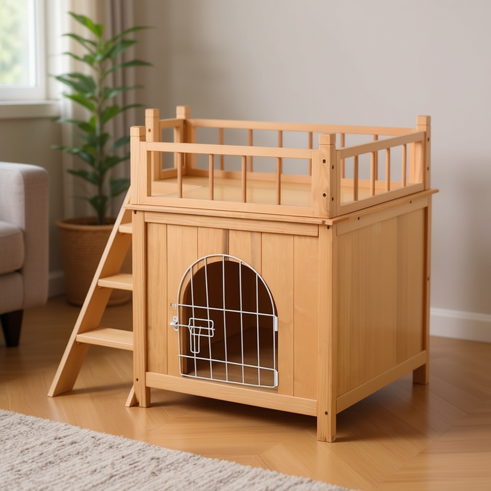Casetta per Gatti in Legno Naturale con Porta in Rete Chiudibile, Stile Classico Rettangolare per Gatti