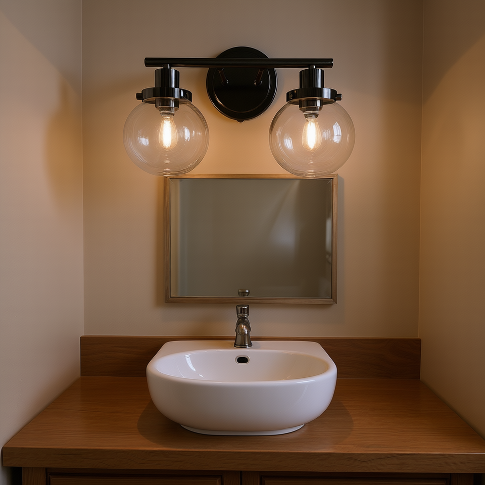 Applique da Parete a 2 Luci Nera, Lampada Vintage in Metallo per Specchio, Paralume in Vetro Trasparente, Illuminazione per Bagno, Finitura Opaca Nichel Spazzolato